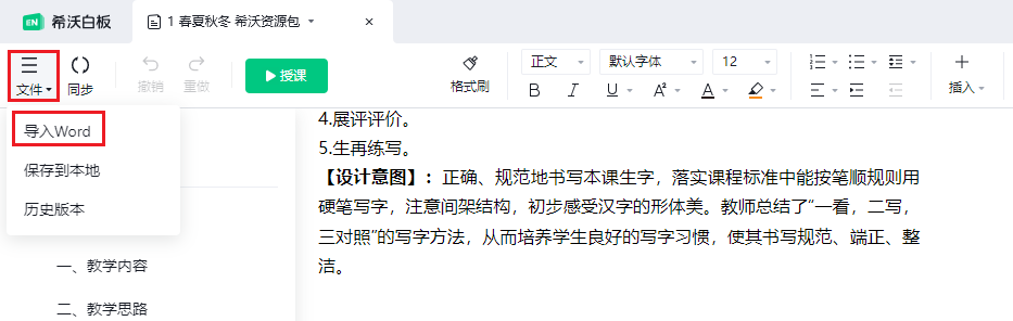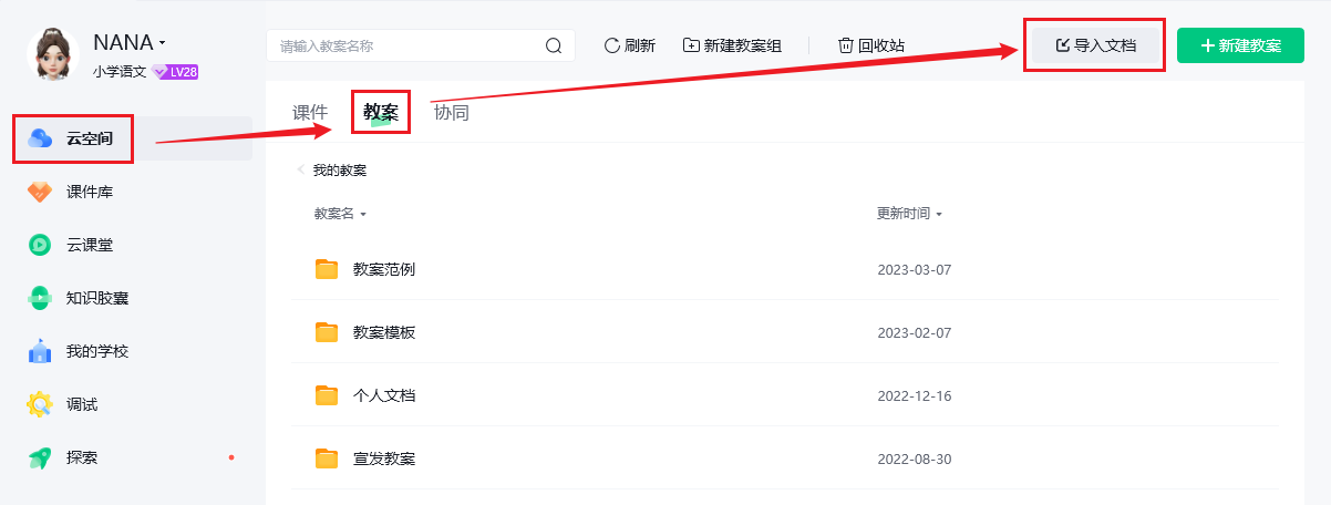 点击【云空间】-【教案】-【导入文档】