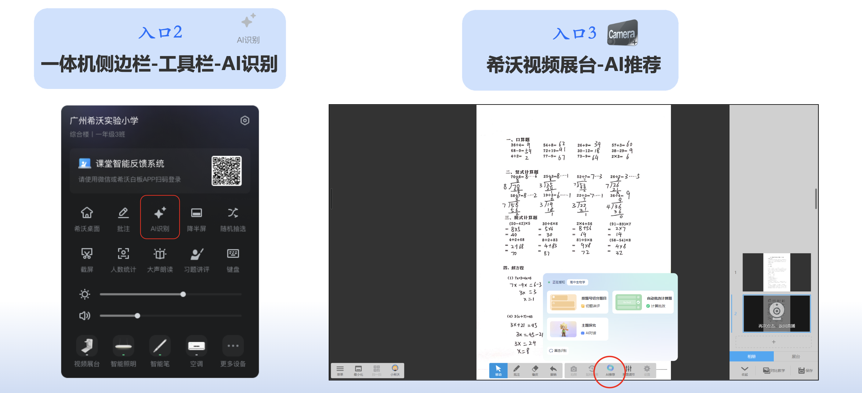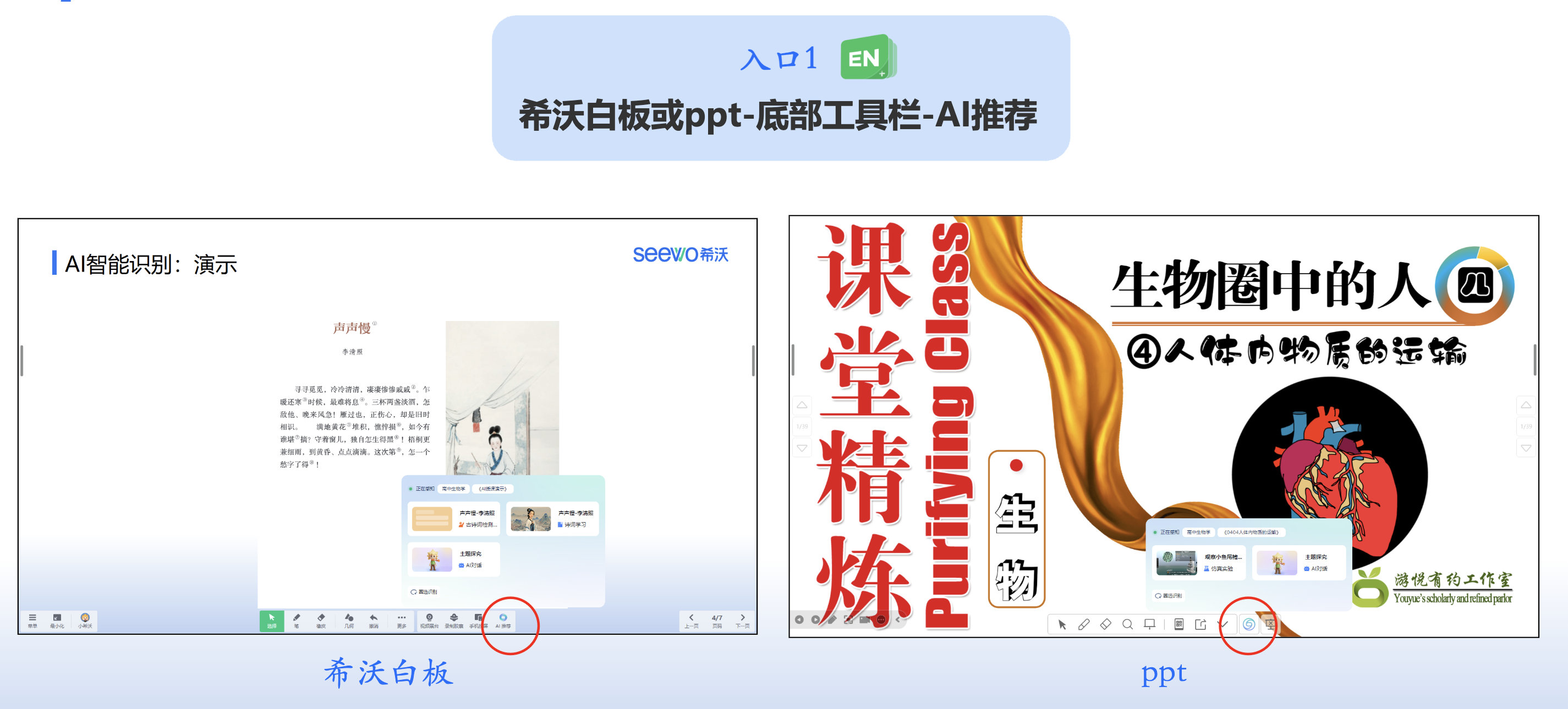 希沃 AI 授课助手是集成于希沃白板、希沃展台、PPT 小工具、侧边栏等工具中。在使用AI授课助手之前,需要确保大屏具备配套的希沃AI算力模块且开通AI服务。满足条件后即可安装【AI识别】全套应用和绑定算力模块,开启使用体验。
