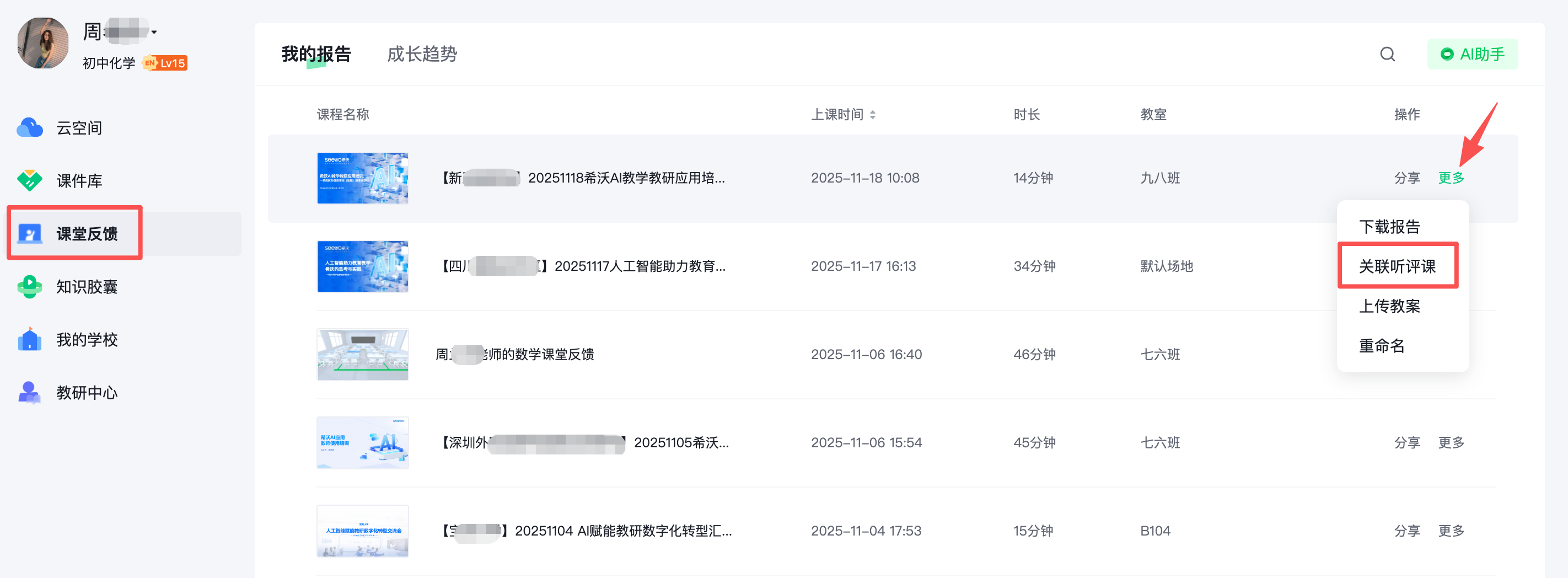 路径三:希沃白板APP-工作台-个人应用“课堂反馈”,点击某份报告右下角“...”,点击“关联听评课”即可成功关联,实现人机协同评价。