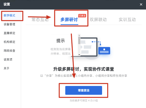 激活步骤:打开希沃品课侧边栏_菜单_升级教学模式_多屏研讨模式_激活使用_输入20位激活码