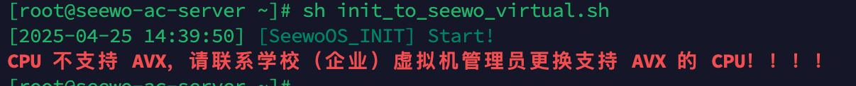 虚拟机部署时:如果遇到提示CPU 指令avx 不支持,请联系学校处理(例如深信服超融合,可以在虚拟化软件--CPU配置--勾选Host模式,其他品牌可以自行百度或咨询FAE),此项内容不通过,后续部署执行不下去。