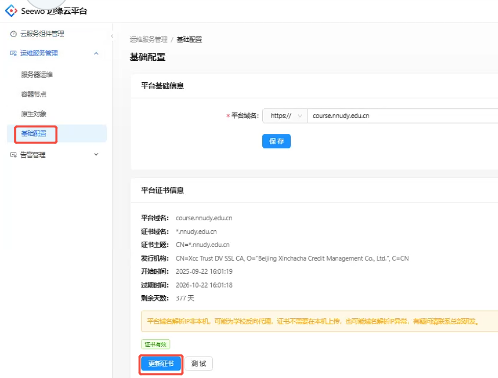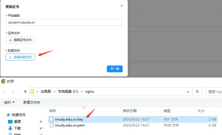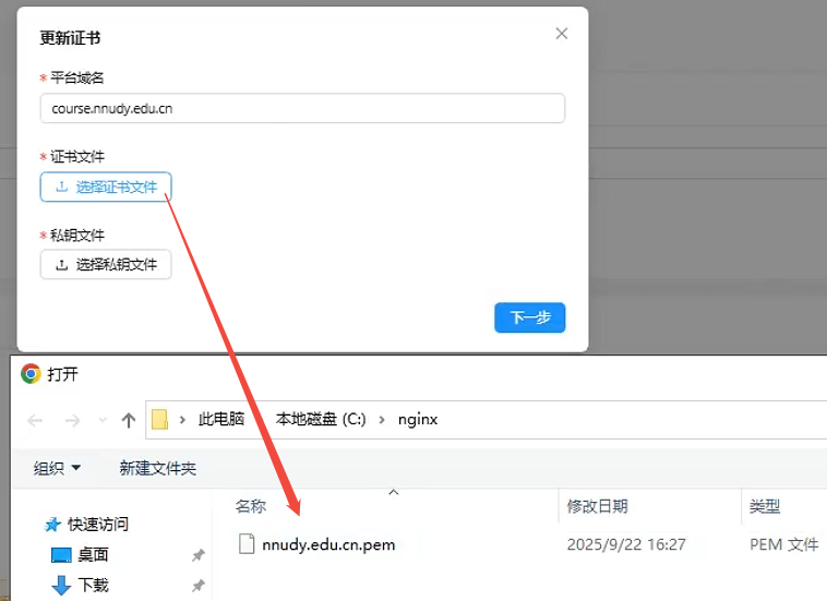3、点击更新证书,分别选择证书文件和秘钥文件进行配置。