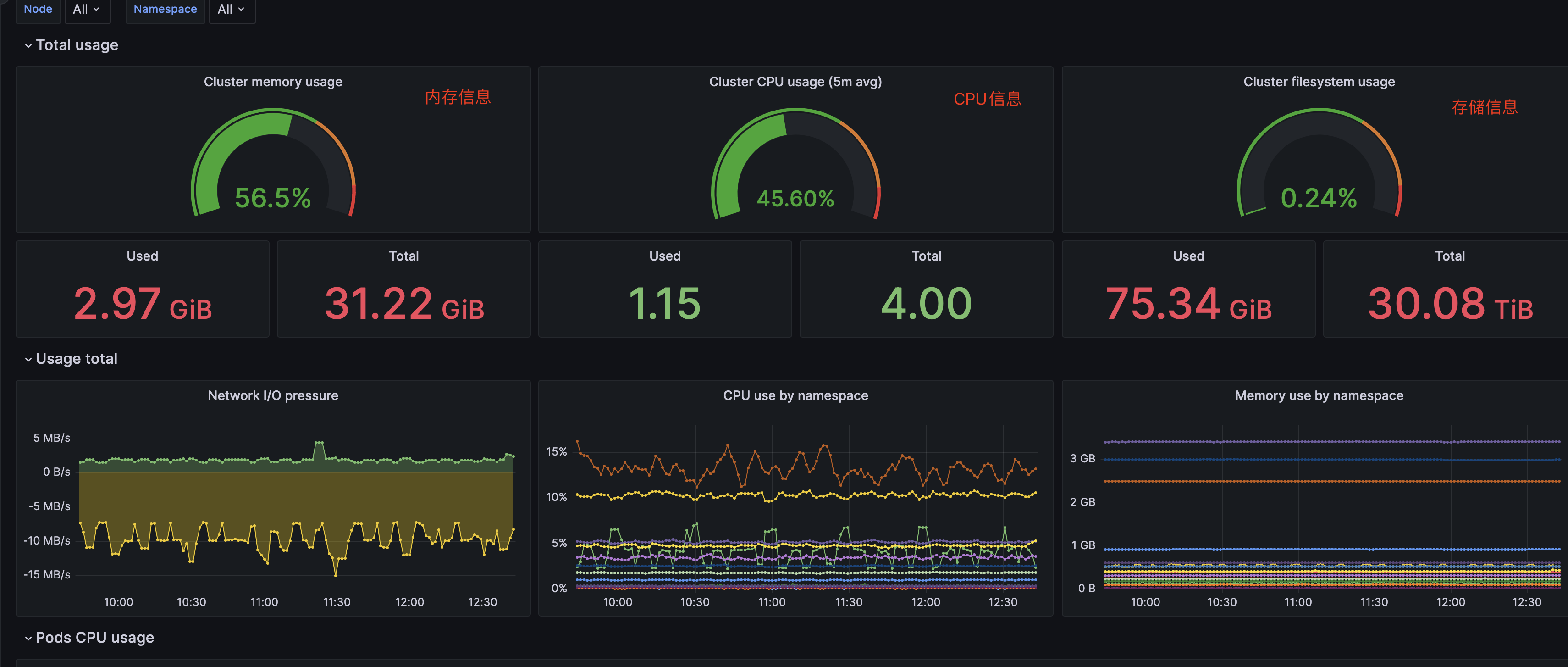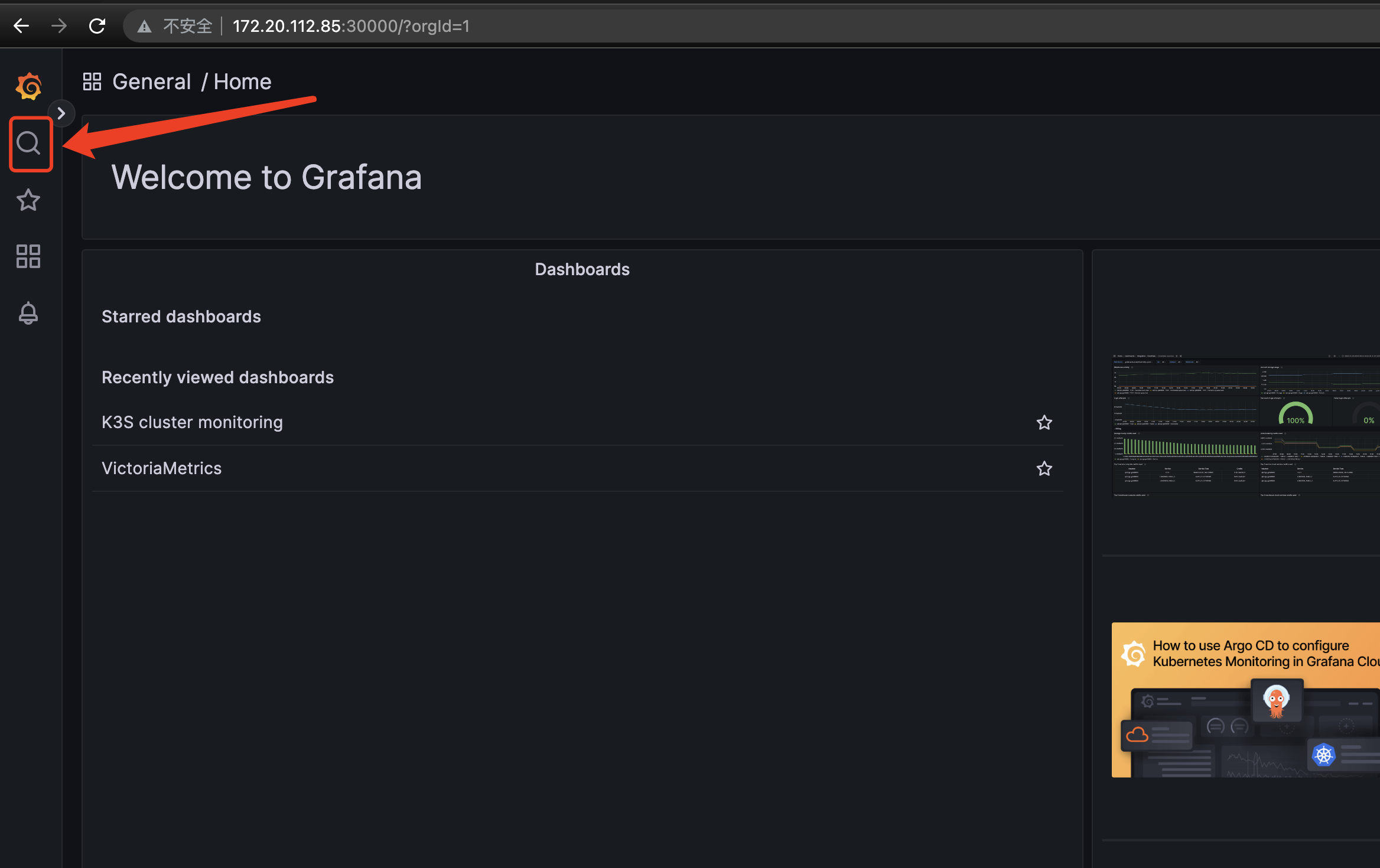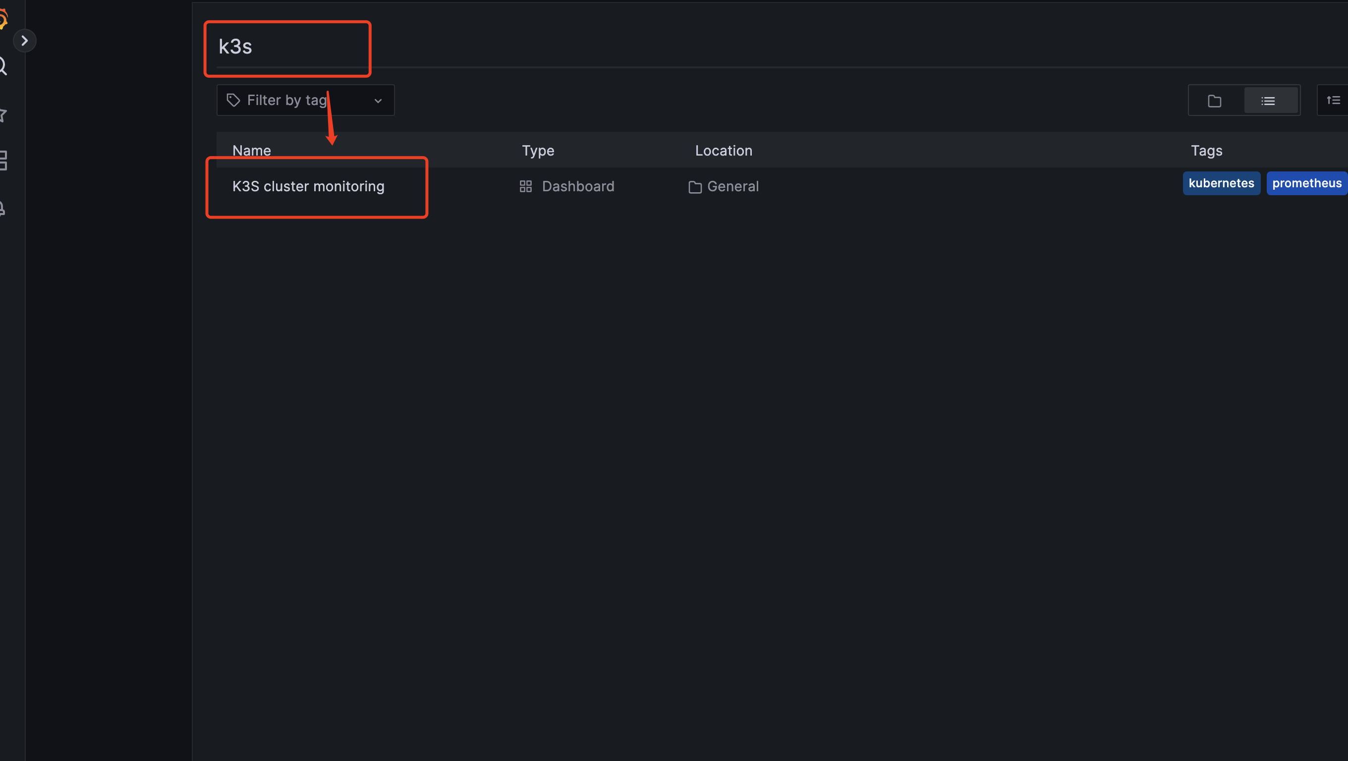 搜索框中输入k3s,此时下放会出现一个K3S cluster monitoring,点击进入面板
