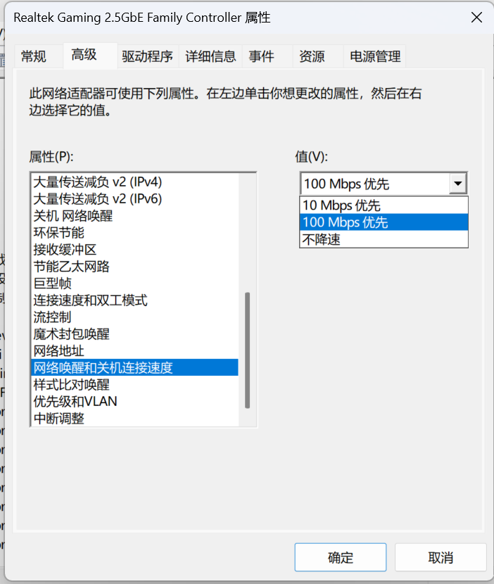3)右键属性,高级,WOL&Shutdown Link Speed/网络唤醒和关机链接速度,值选择“100Mbps优先”。或者选择“不降速”