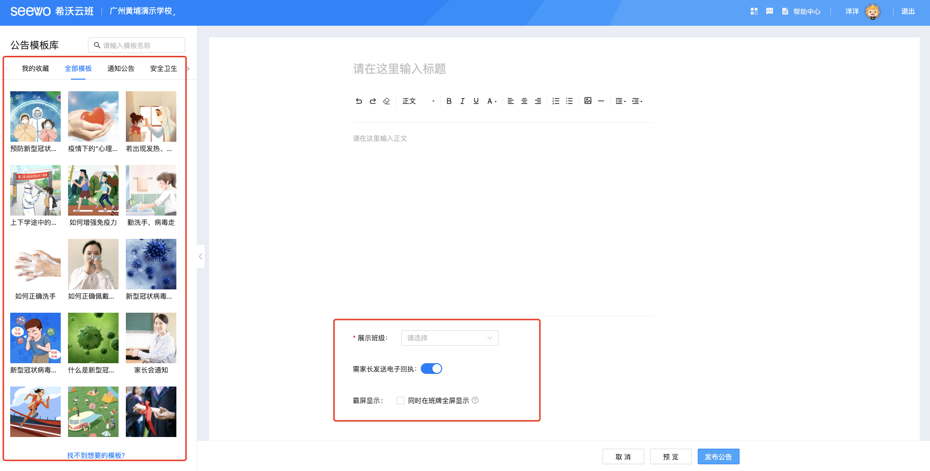 同样,管理员在发布公告时可以选择将公告发布到全校或任意指定班级。