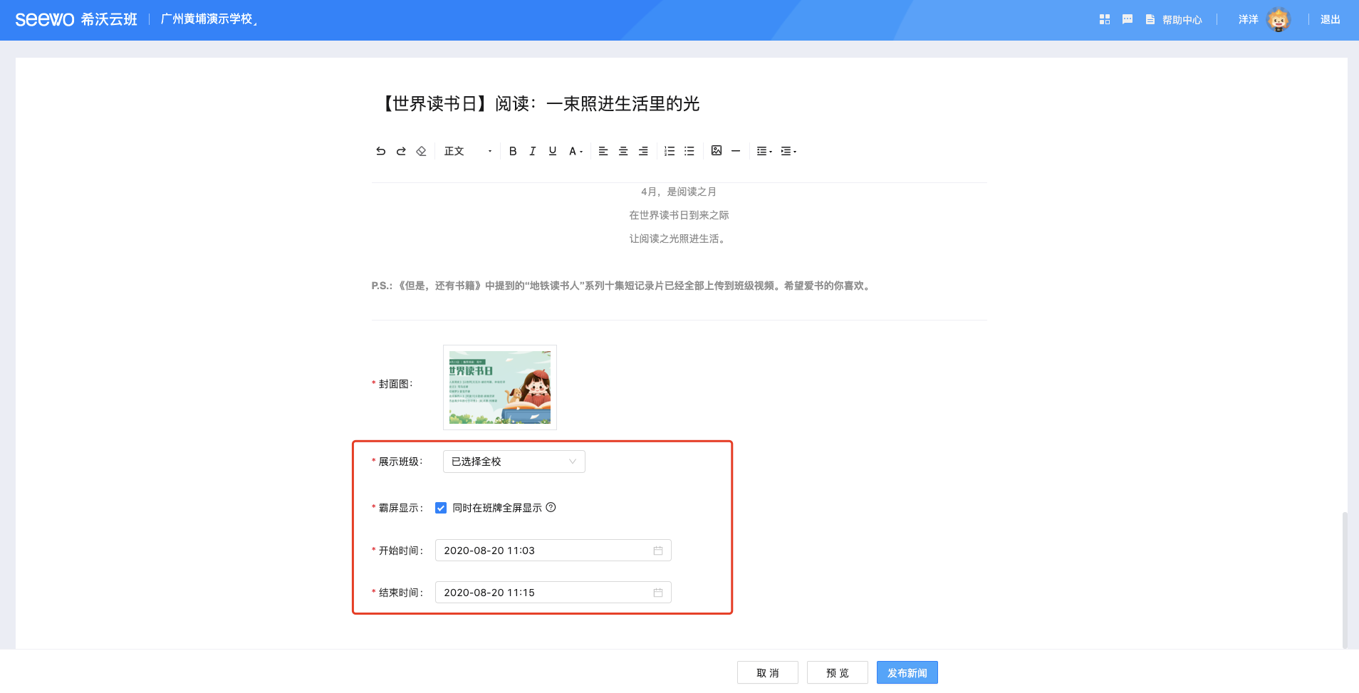管理员在发布新闻时可以选择将新闻发布到全校或者指定的任意班级。同时,对于比较紧急或重要的新闻管理员可以选择指定时间在班牌霸屏播放。