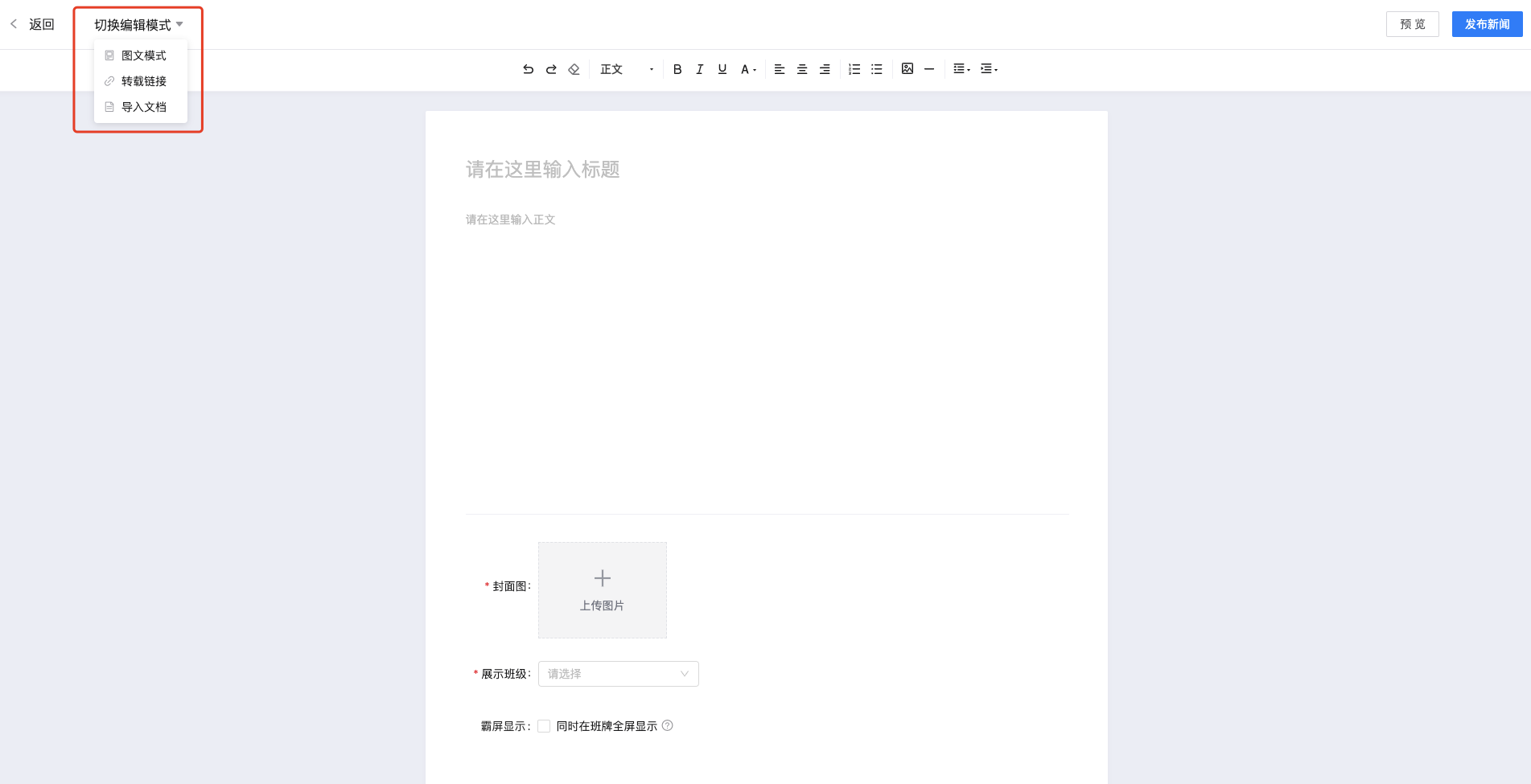新闻页面包括图文模式、转载链接(直接发布复制的链接到班牌端)、导入文档(当前仅支持PDF)3种方式。