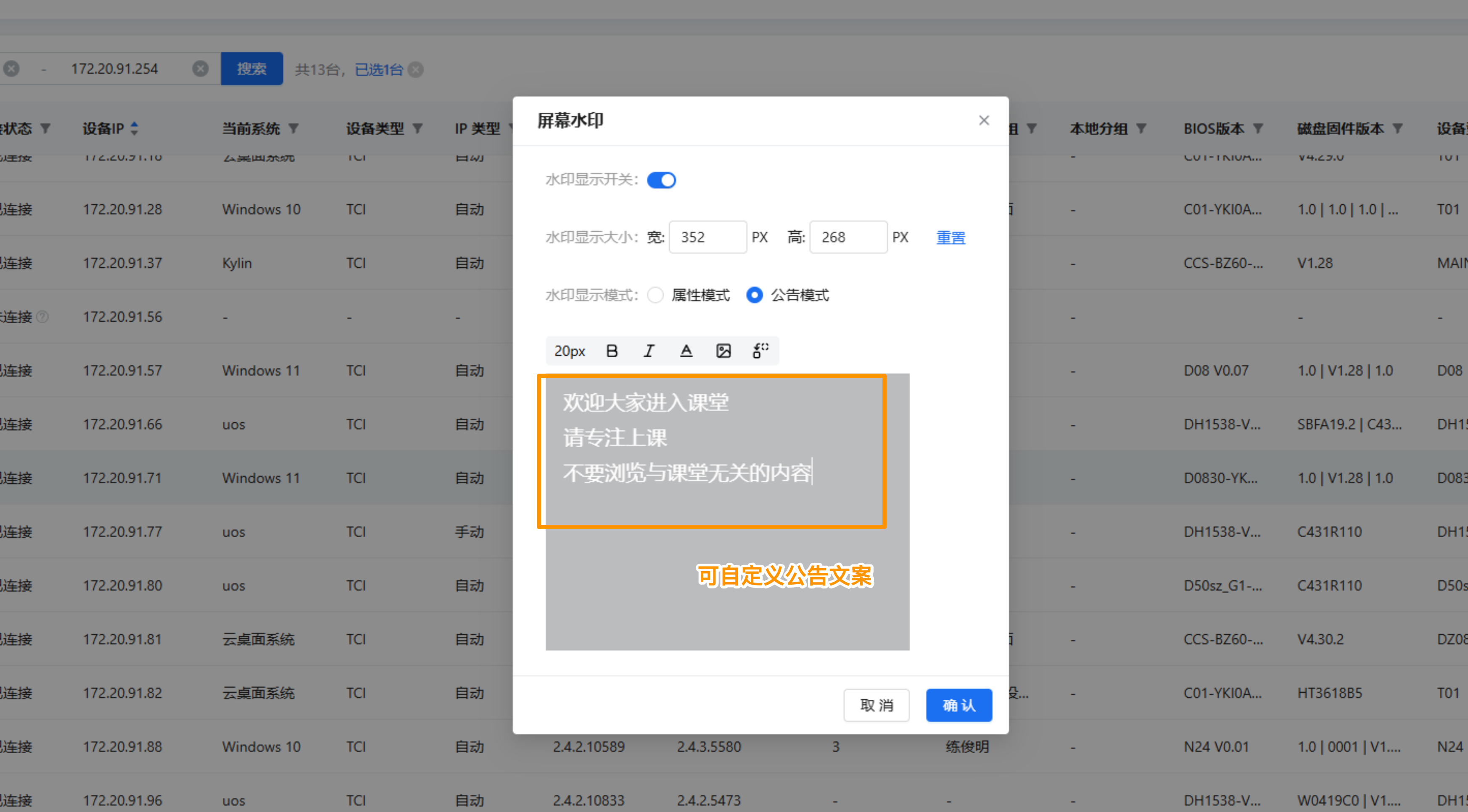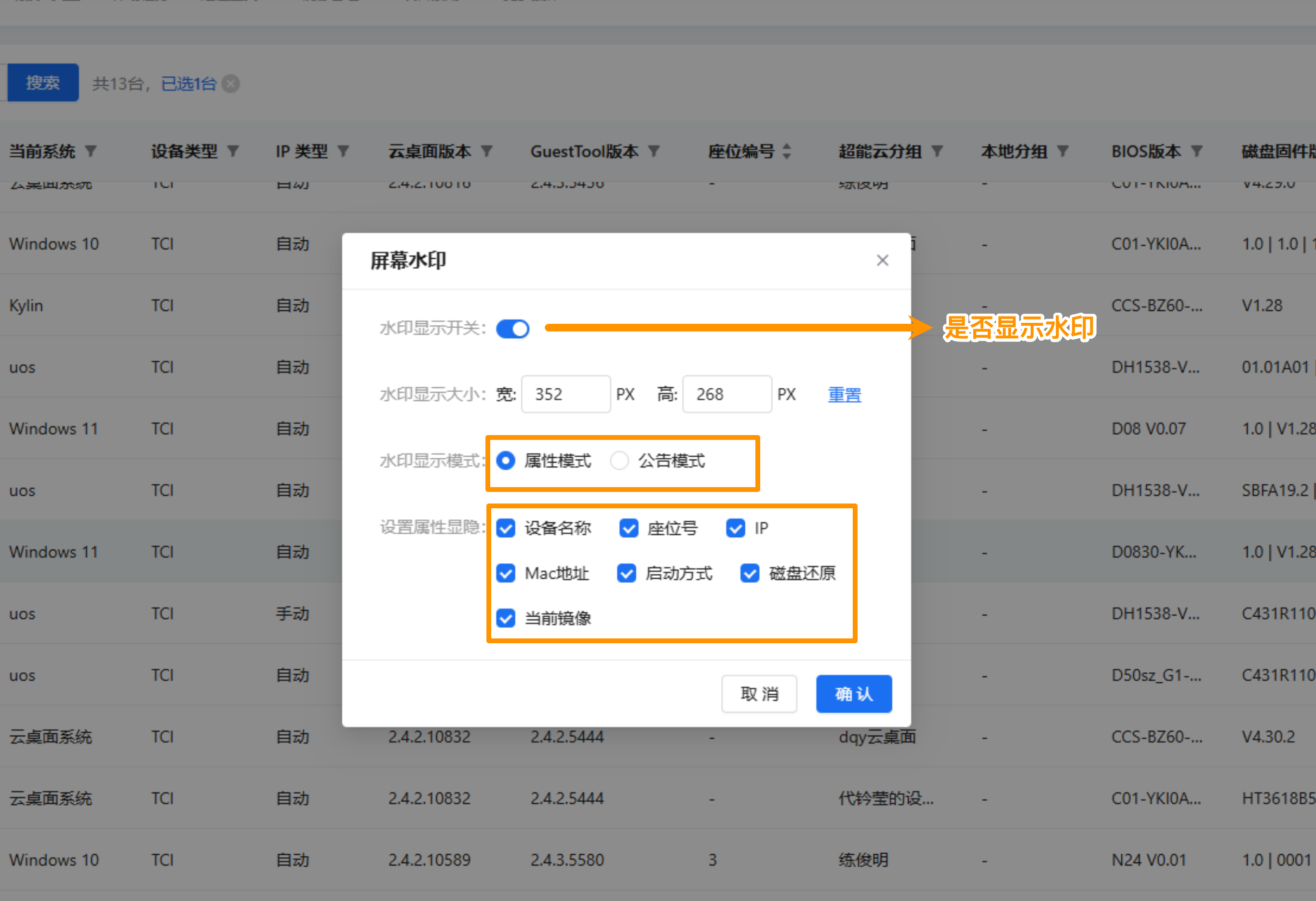第3步:可设置是否显示水印、水印大小。可以选择“属性模式”或“公告模式”,使用“属性模式”可选择需要显示哪些设备属性