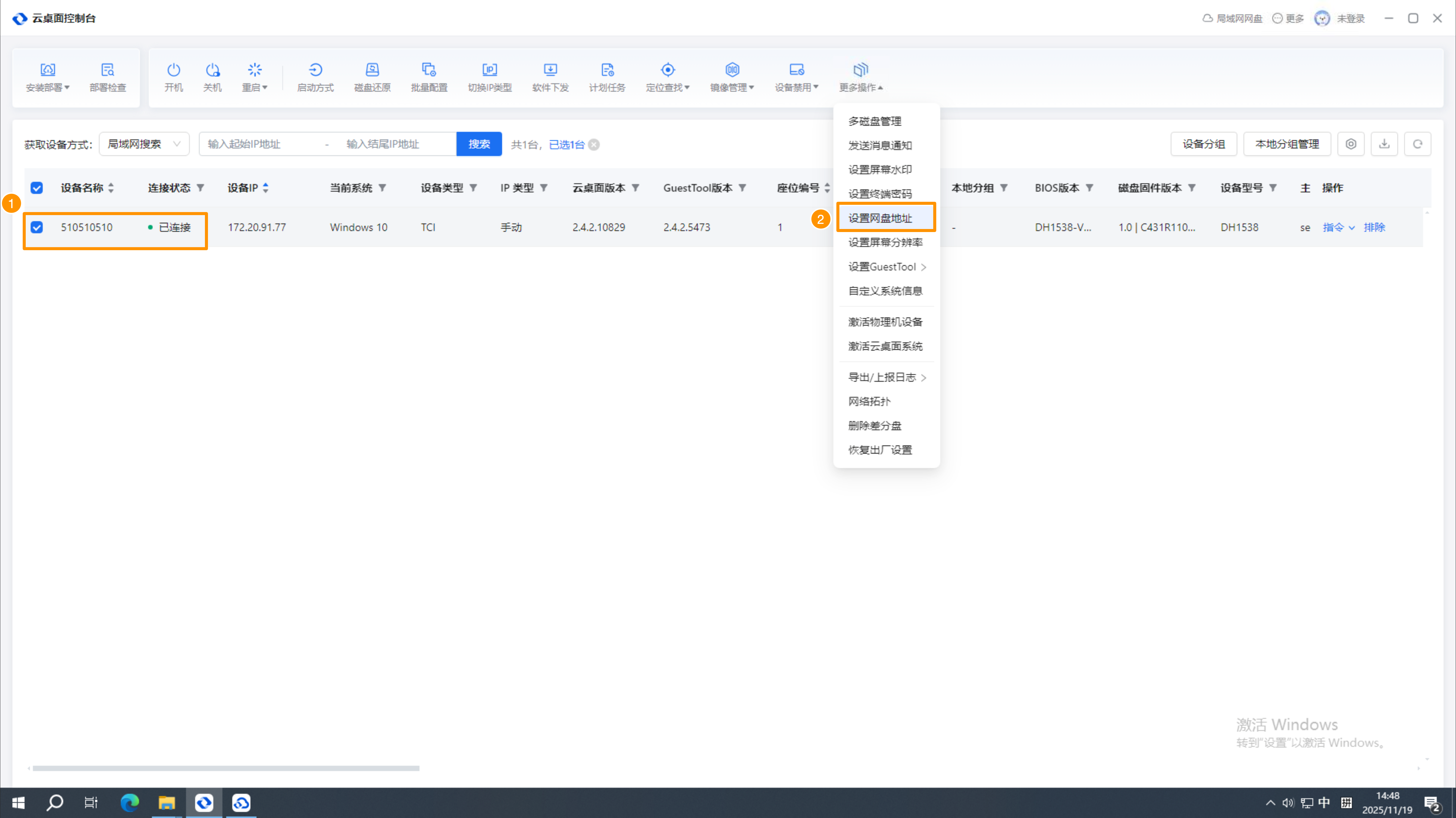 第四步:返回「云桌面控制台」,勾选需要共享空间的设备,点击【更多操作】-【设置网盘地址】