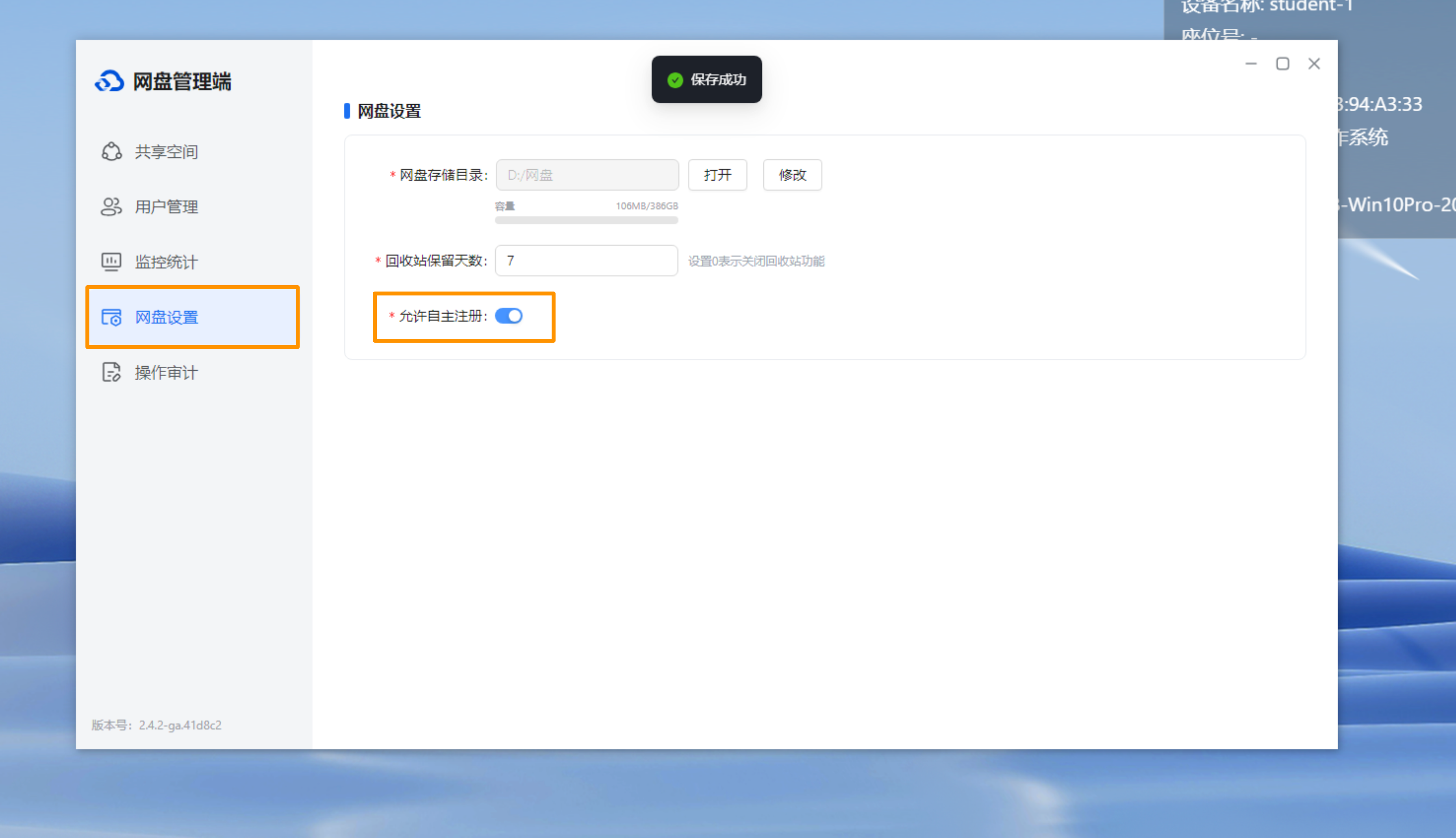 2、教师也可以在【网盘设置】中,开启【允许自主注册】,即允许学生在个人设备上自行注册网盘用户名、密码