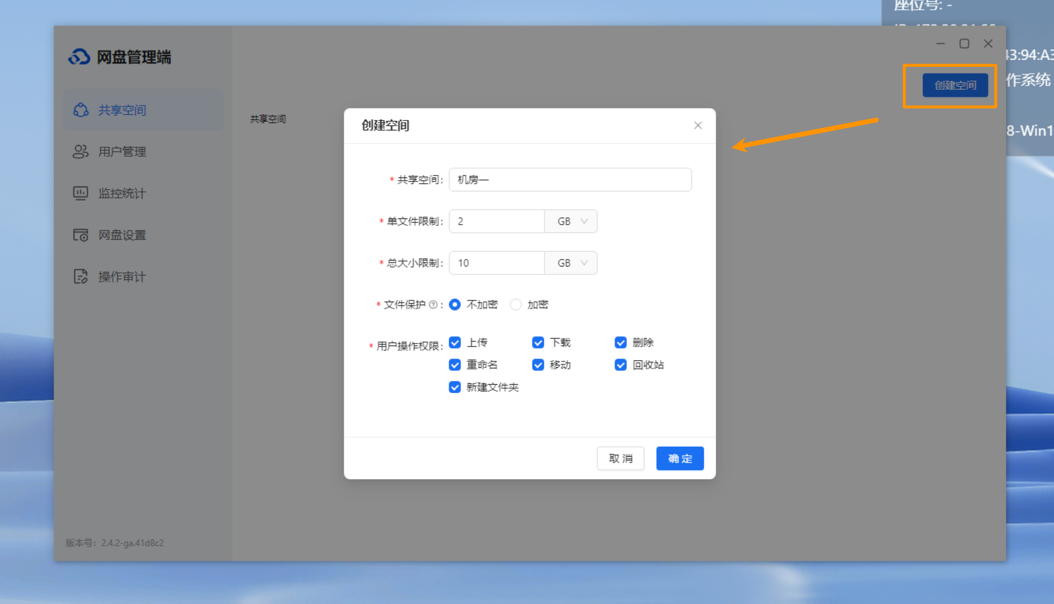 每个共享空间可独立设置单文件/空间总大小限制,文件是否需要保护,以及空间内其他用户的操作权限等。