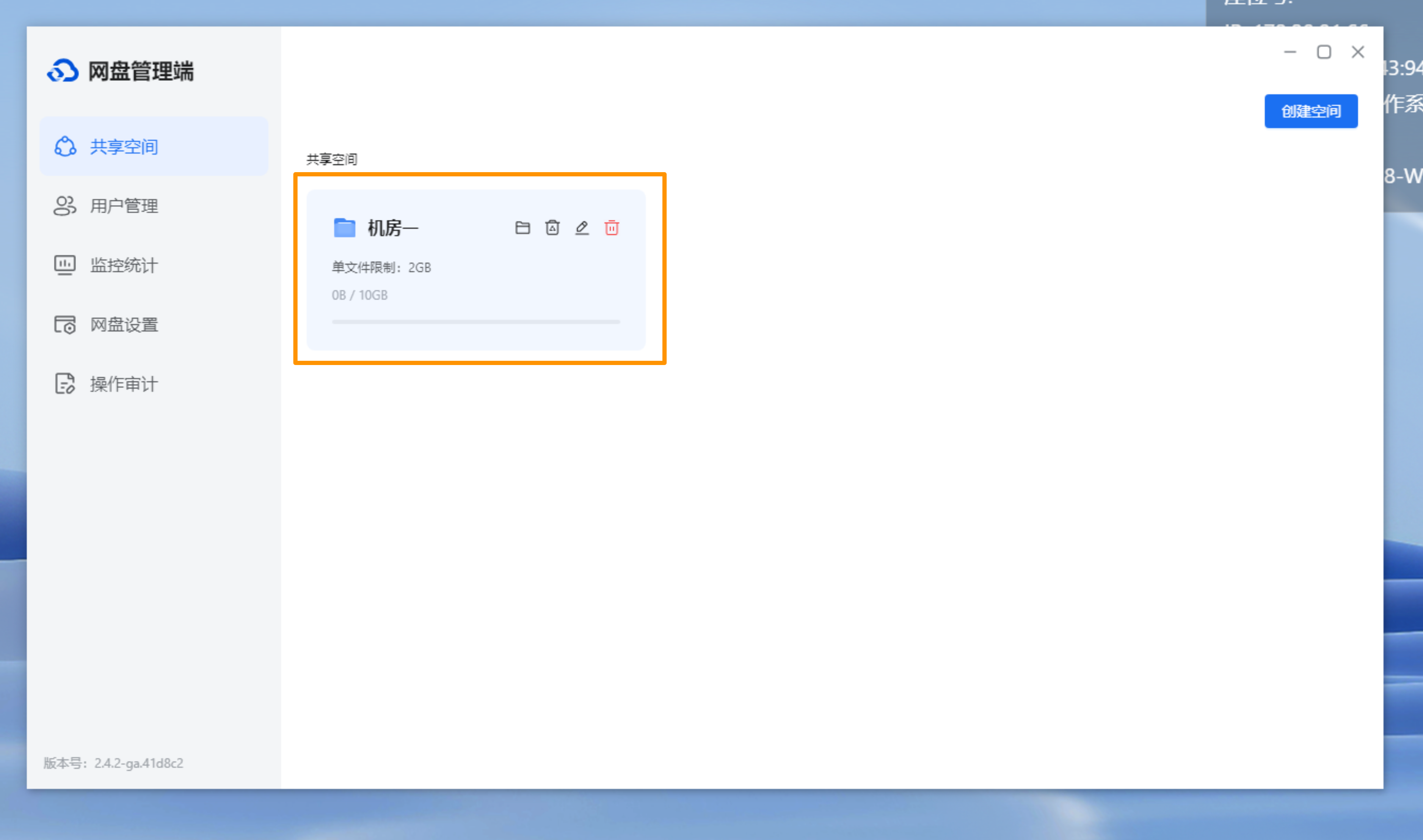 第三步:进入网盘管理端后,可点击【共享空间】-【创建空间】,可根据不同的年级、班级需求,设置多个共享空间。