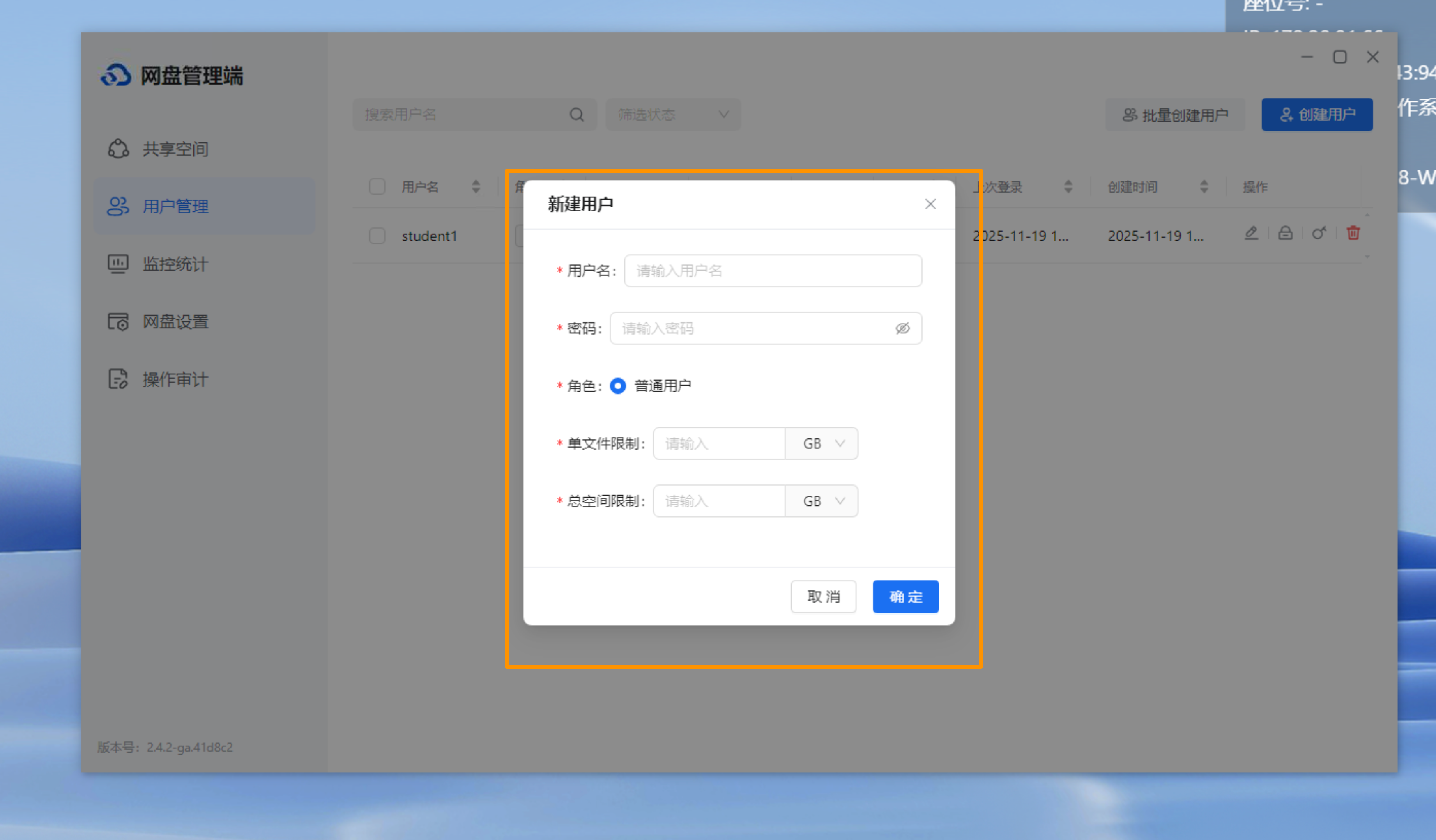 1、老师/管理员可在网盘管理端中,点击【用户管理】, 创建需要使用网盘的用户名、密码等,同时支持批量创建用户