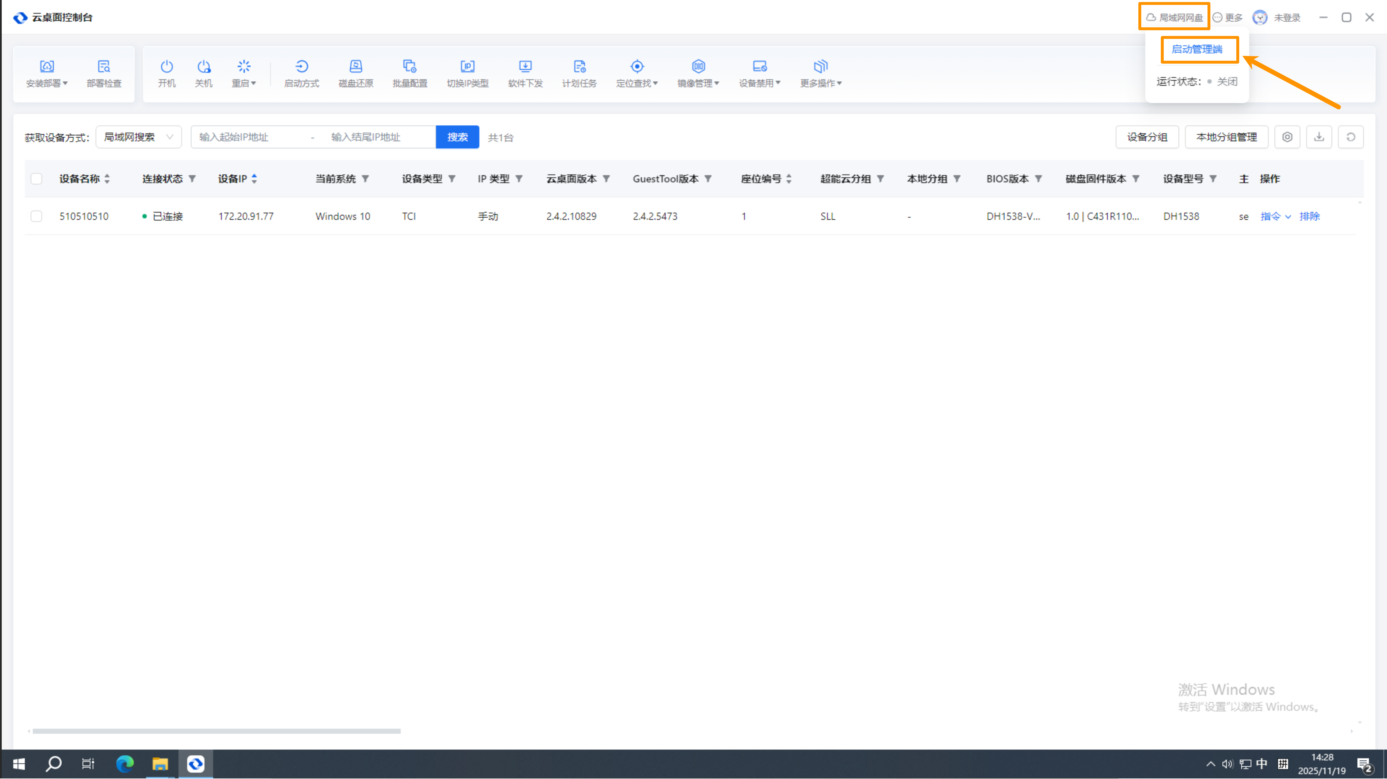 第一步:老师打开云桌面控制台后,点击右上角【局域网网盘】-【启动管理端】