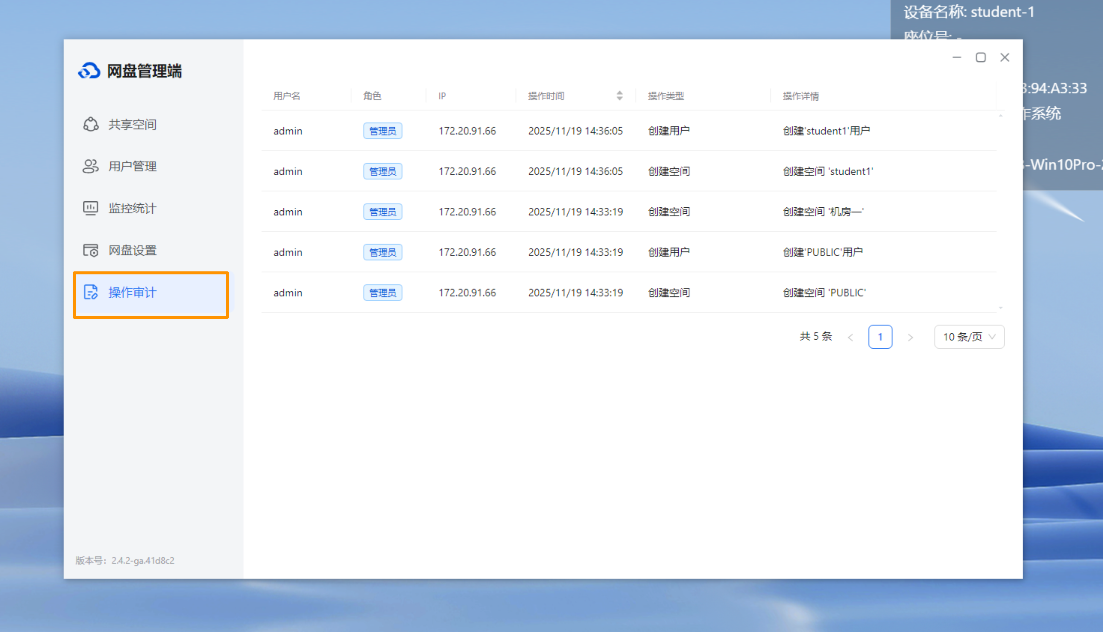 为便于老师/管理员在局域网中分享文件至的其他设备,云桌面提供局域网网盘功能,管理者可设置共享网盘,同时支持设置个人用户网盘