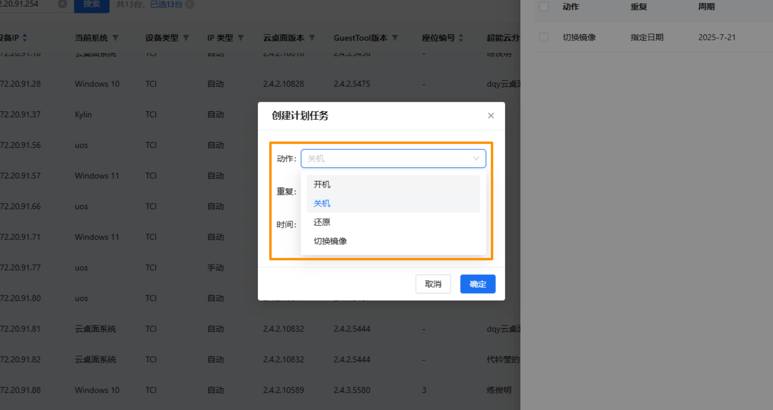 第三步:可选择相关的任务动作,如“开机、关机、还原、切换镜像”等