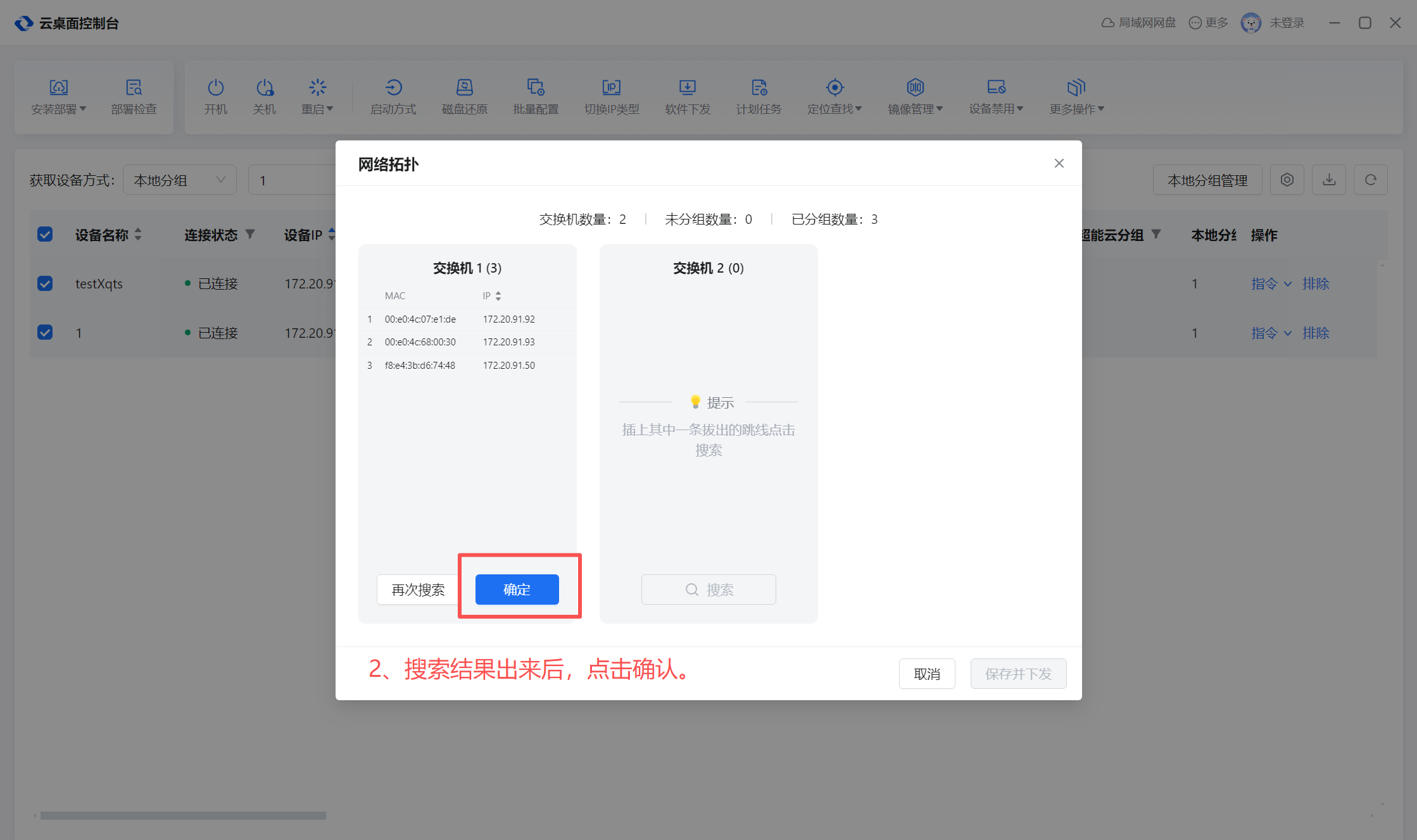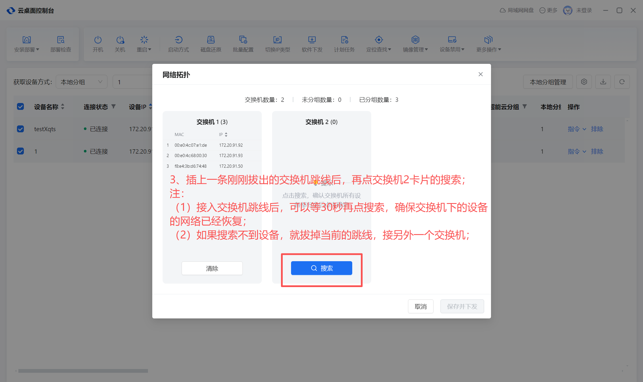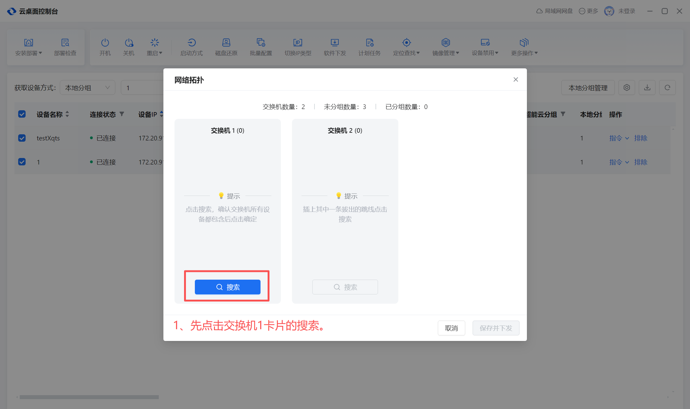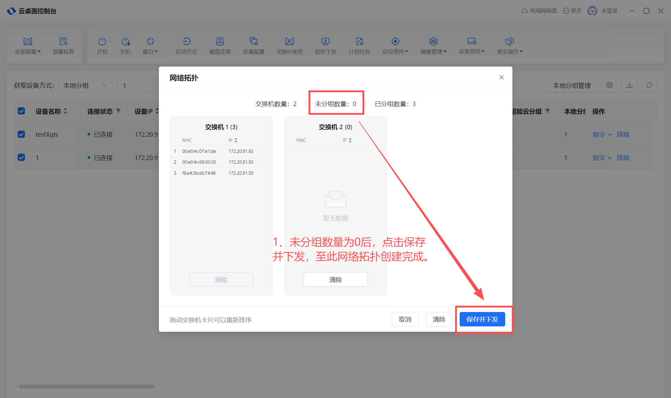 步骤4:当全部交换机下的设备都搜索完成,未分组数量为0后,点击保存并下发,至此网络拓扑创建完成,可以继续执行同传、更新云桌面、安装云桌面、下发镜像等操作;