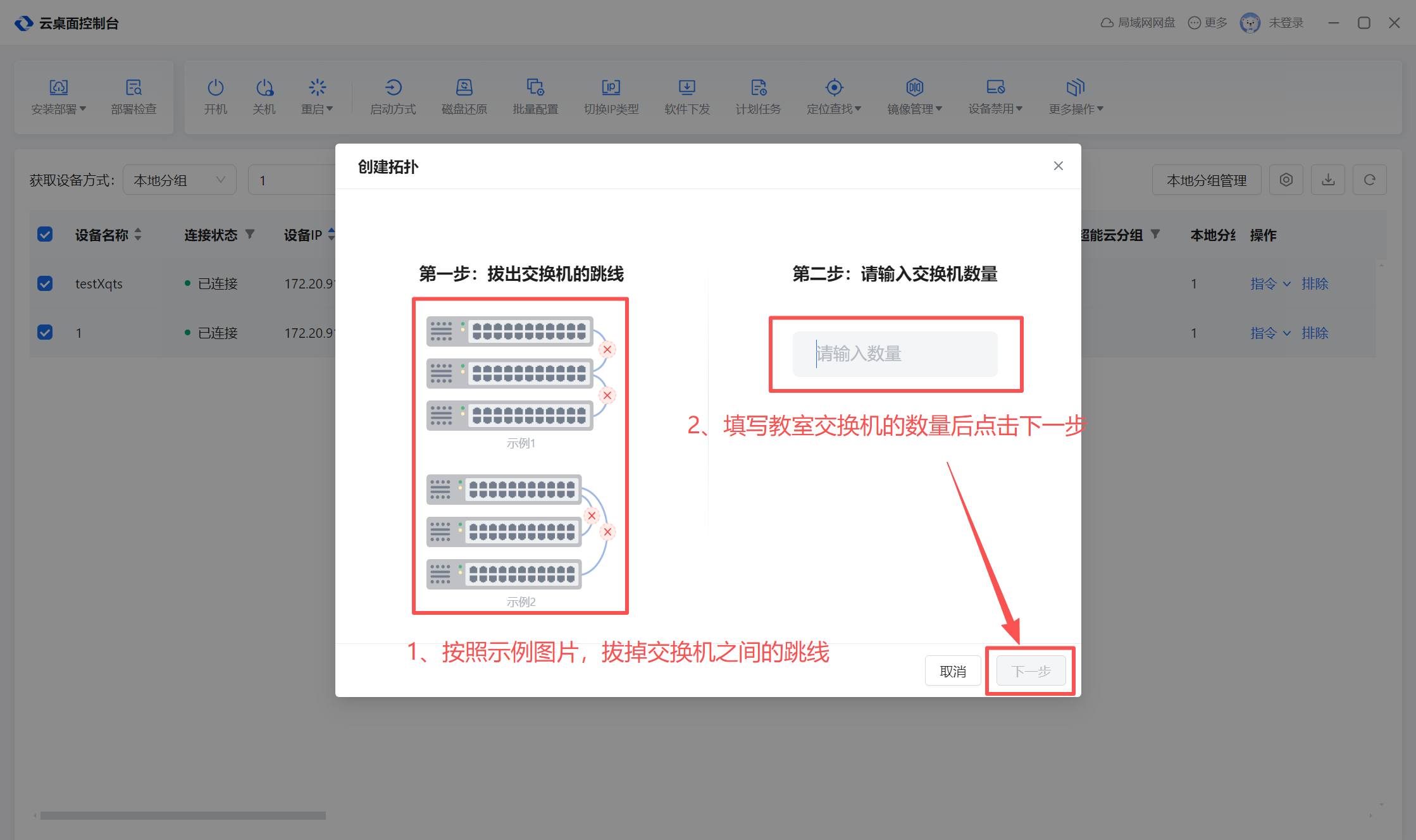 步骤2:拔掉交换机之间的跳线,在控制台输入教室的交换机数量(注:这里一定要断开交换机的跳线,如果两个教室的设备共用交换机,需要把其他教室的设备先关机,避免设备分组混乱)