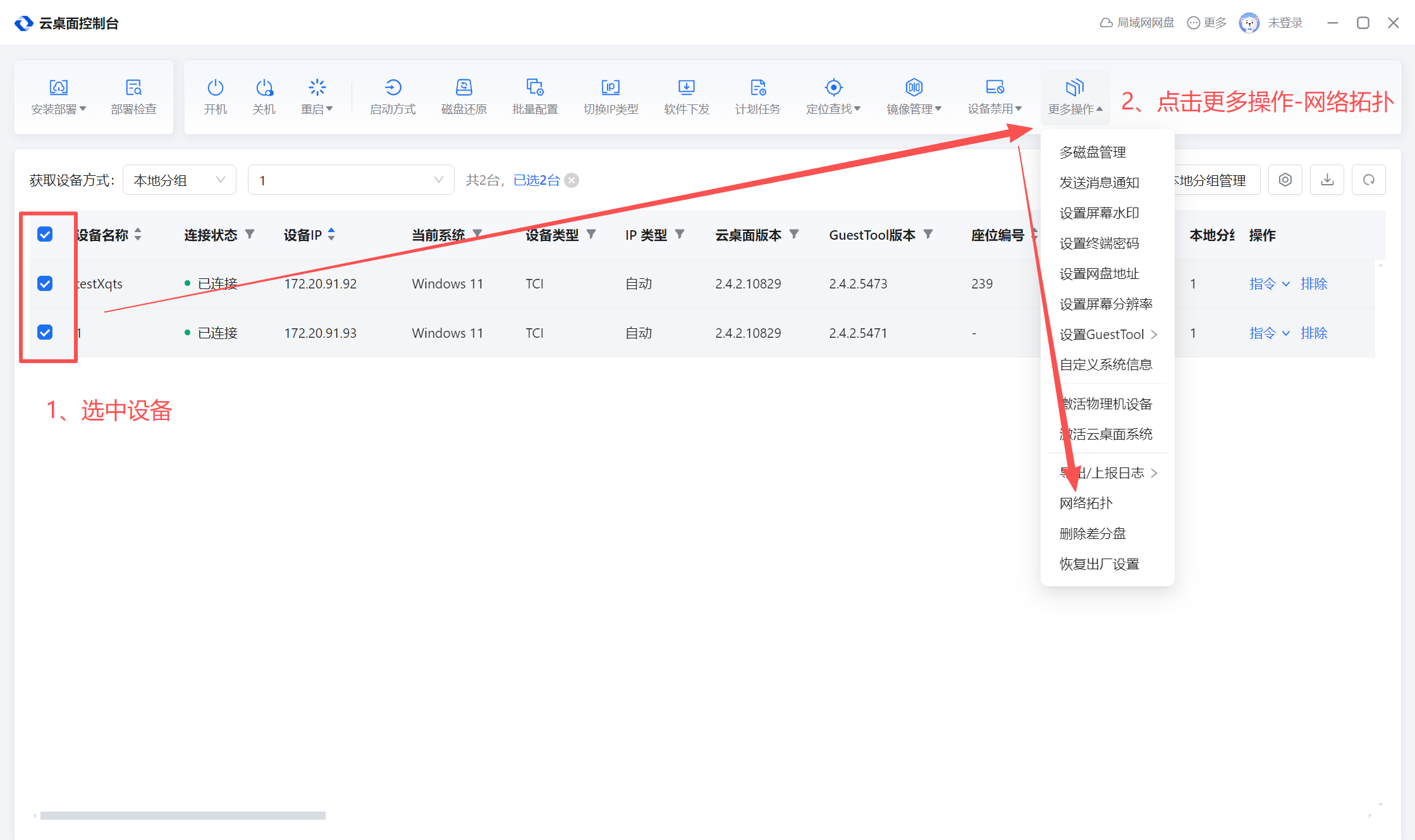 步骤1:控制台选中需要同传的设备,点击更多操作-网络拓扑;