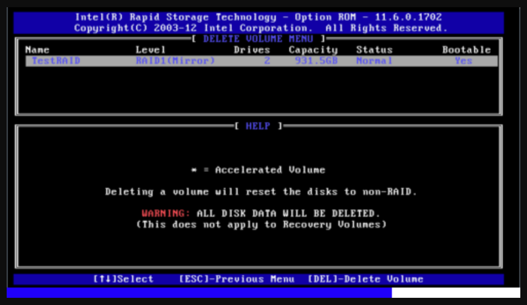 使用方向键,选择【Delete RAID Volume】,回车确认