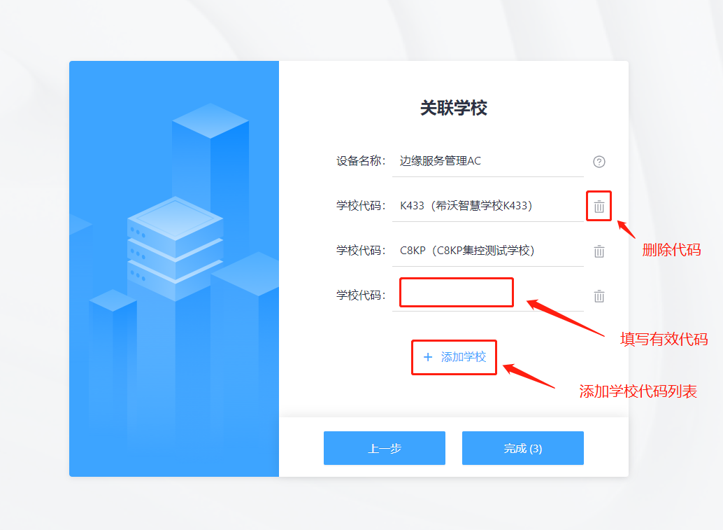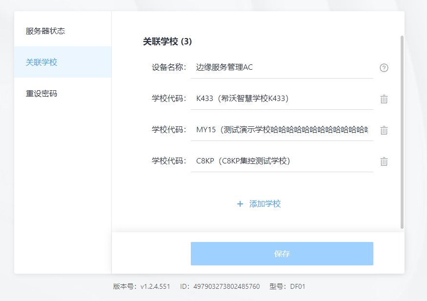 设置设备名称及关联学校代码,如下图所示: