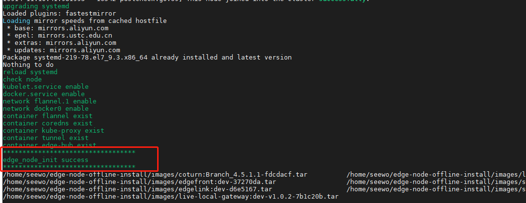 等待部署功能运行结束,如果屏幕出现绿色“edge_node_init success”提示,则表示部署成功。如下图所示: