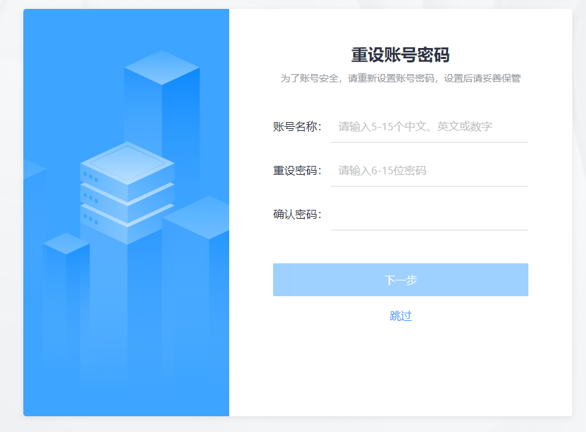 初次登录后可以重新设置账号密码,也可以跳过,请根据提示进行操作。