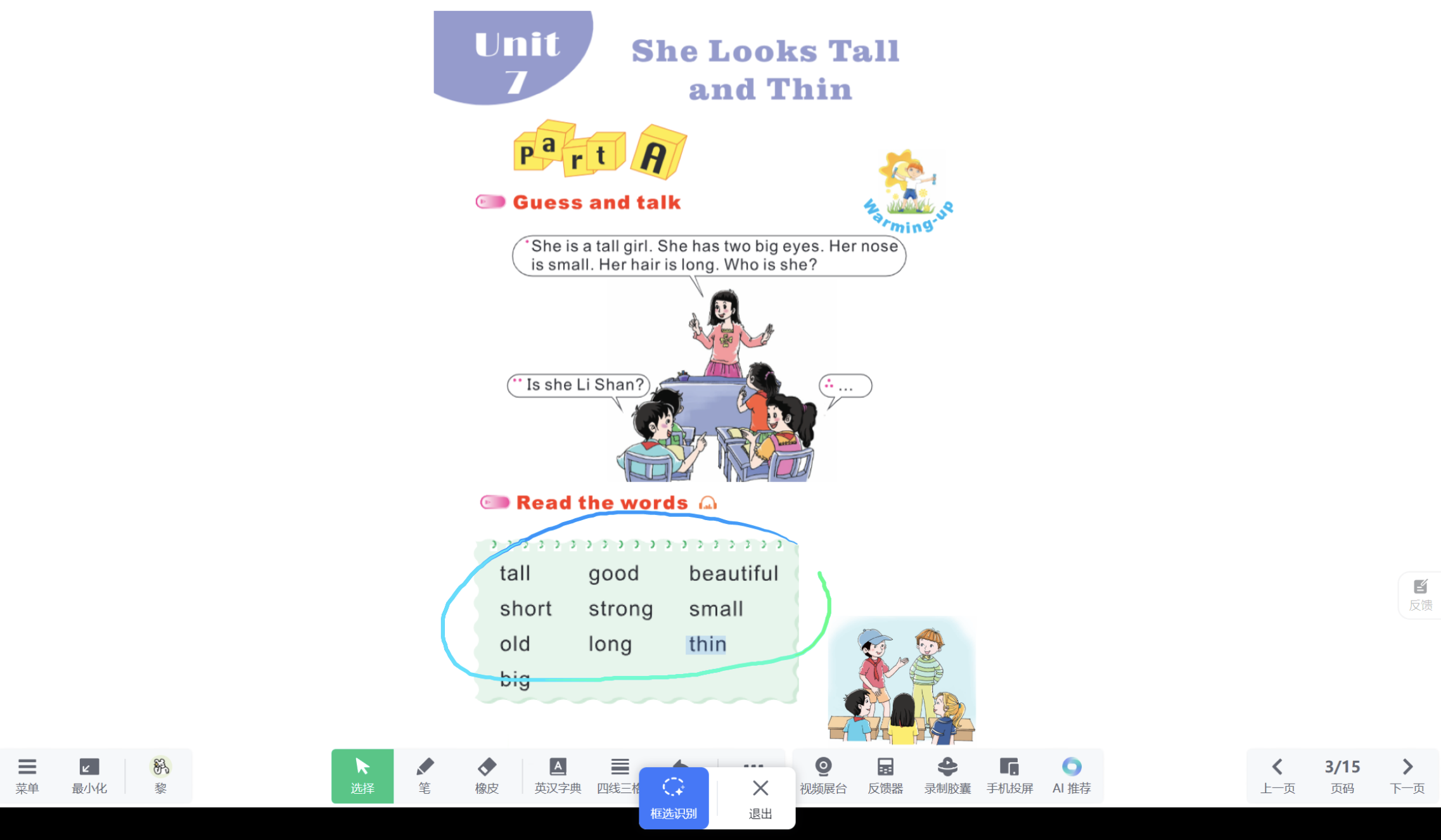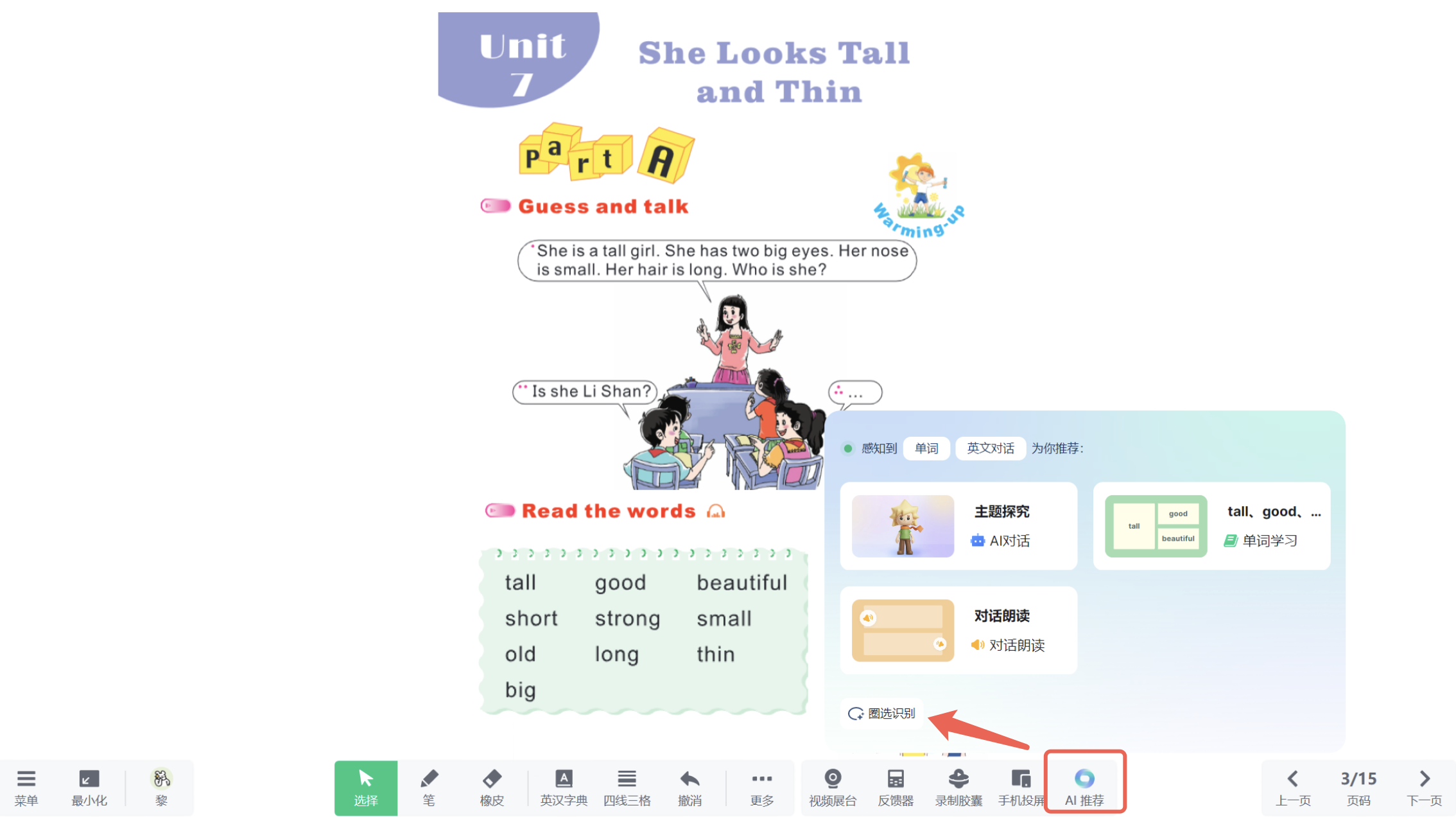 1.在授课页面中点击「AI推荐」中的「圈选识别」,即可圈中具体内容进行智能识别。
