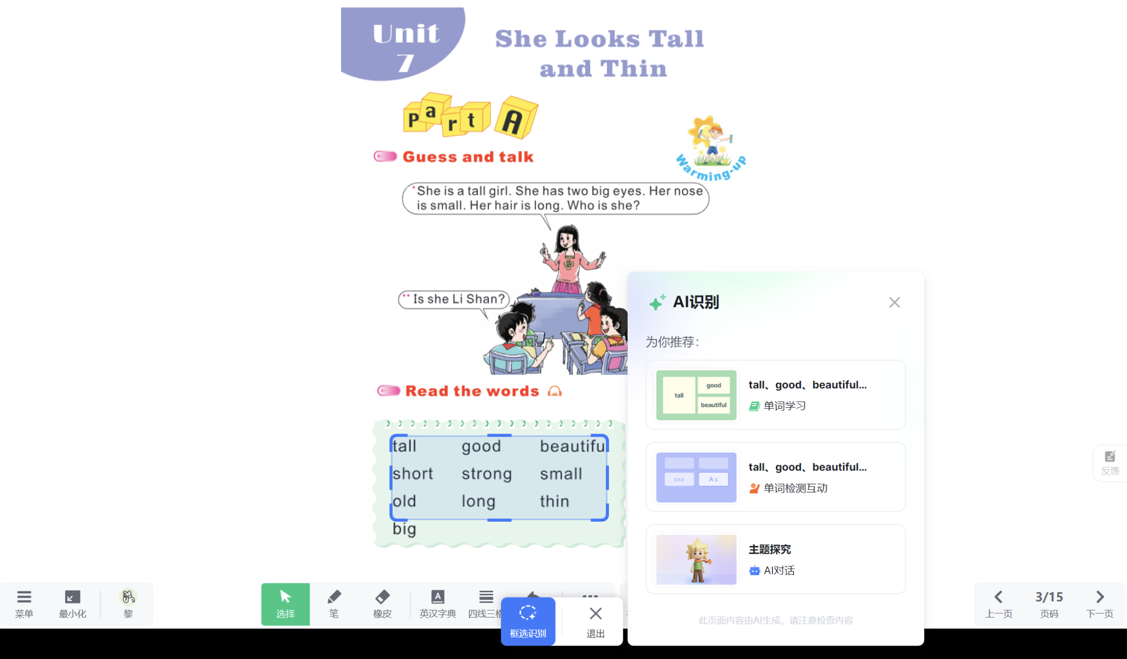 2.识别后AI会推荐相关内容,直接拖拽四个角即可调整框选范围,老师可以选择用于教学讲解。