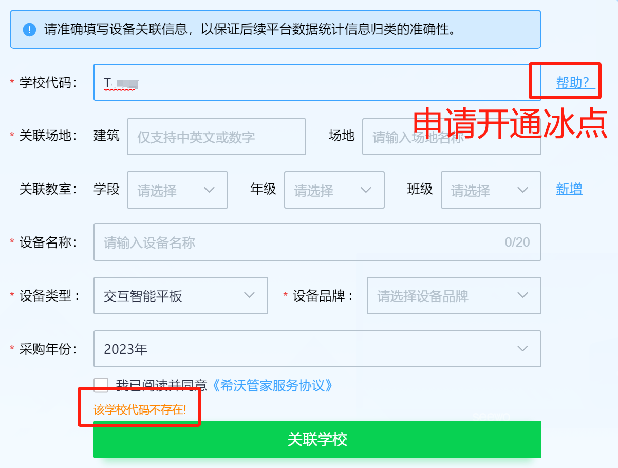 (4)绑定场地:希沃管家绑定学校代码和关联场地信息(提示无学校代码,点击“帮助”申请)
