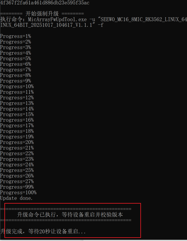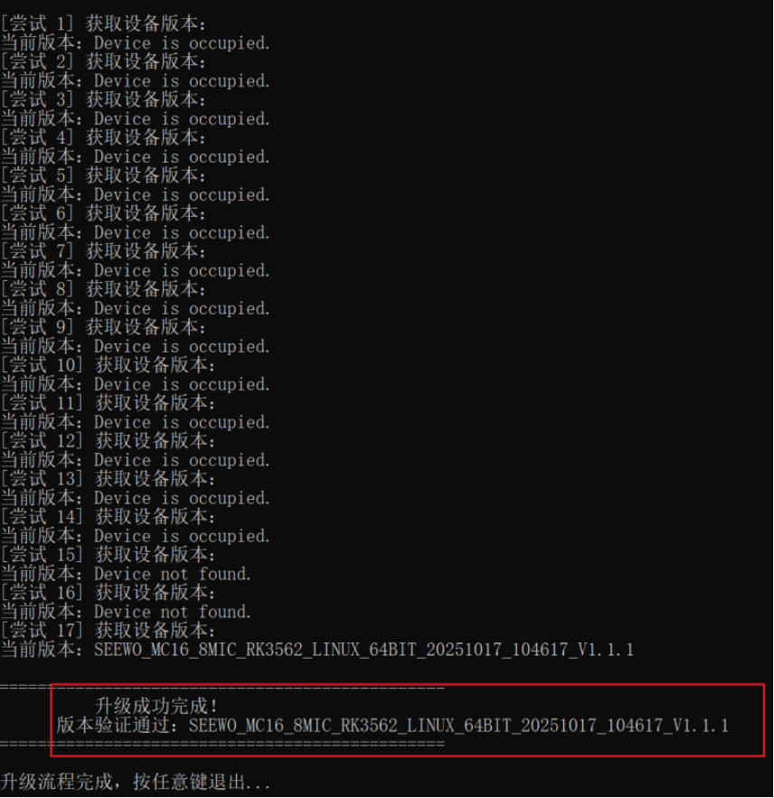 第四步、升级完成后会有对应的提示,等待20秒设备重启完后会提示对应的版本号,核对版本号OK后,按提示操作即可