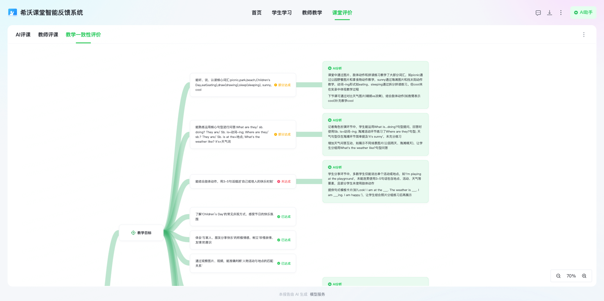 当系统检测到该目标/环节已达成时,会标记达成。当检测到部分达成或者未达成,会高亮标记,并形成AI分析建议,提供给老师参考。