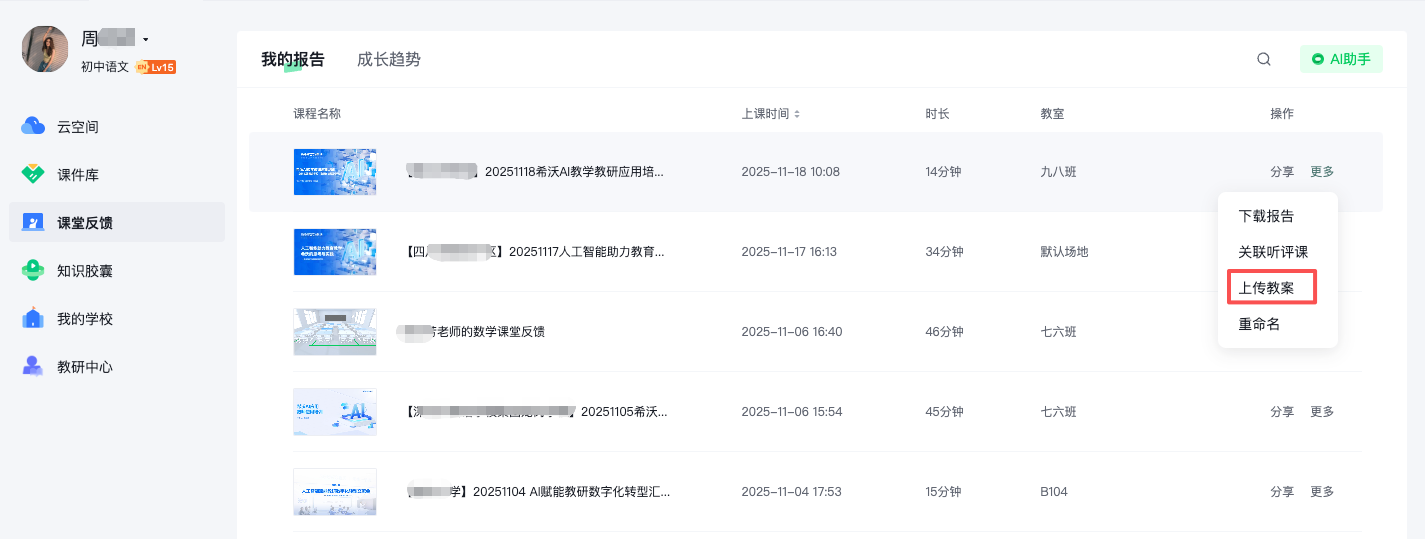 报告所属老师或者学校管理者,可以支持随时移除教案或者重新上传,上传后将重新触发AI分析。