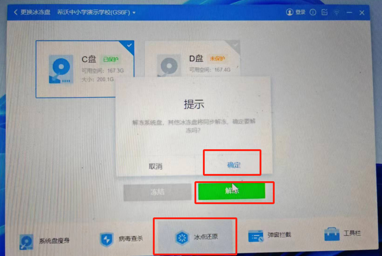 · 打开安装好的新版管家,进入【冰点还原】功能,进行解冻操作,重启设备;(重启之后管家会还原到破损状态,但设备处于解冻状态)
