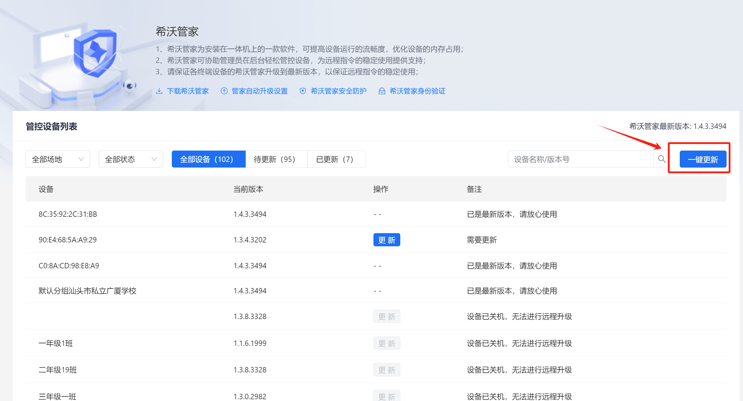 登录集控平台-系统设置-希沃管家-右上角一键更新,即可远程更新全部设备管家。