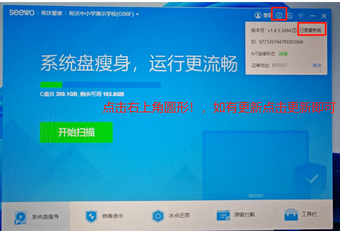 在希沃管家端,点击右上角圆形叹号,进入点击更新(部分老版本无该功能,只能通过易+官网下载安装最新版本)