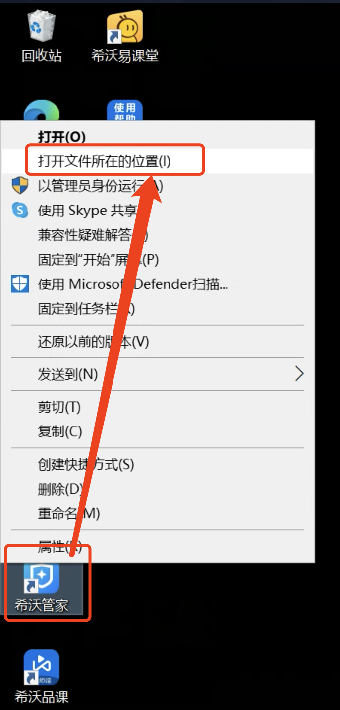 1、在桌面上找到“希沃管家”图标,右键“打开文件所在的位置”