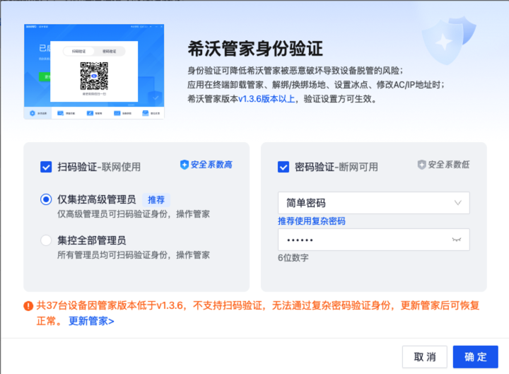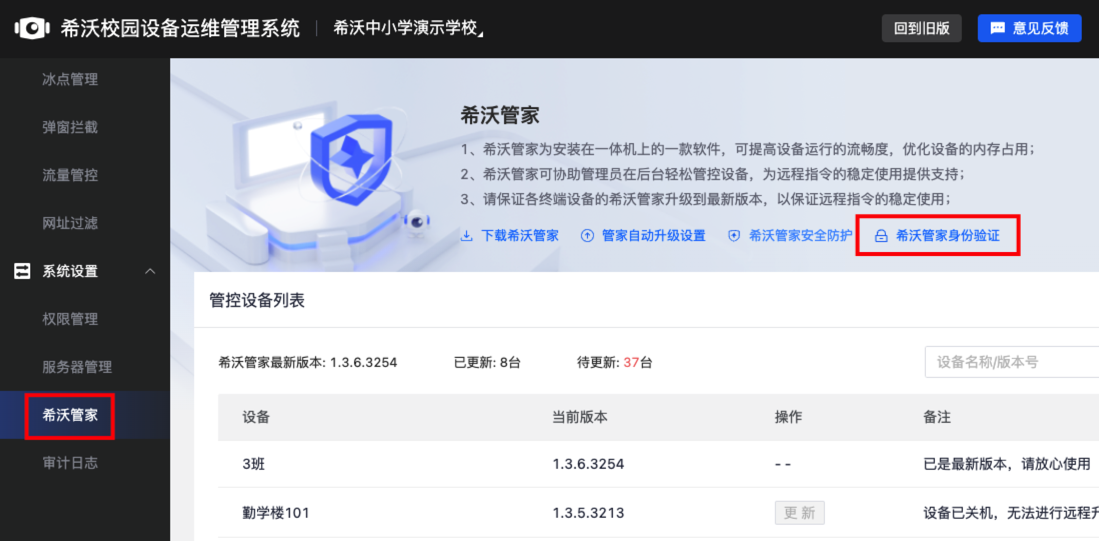 高级管理员登录集控后台,进入希沃管家页面,点击右上角【希沃管家身份验证】,即可查看或修改“希沃管家密码”(也是冰点密码)