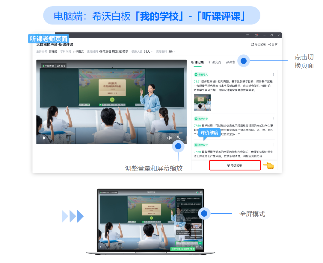 老师可以添加听课记录,全屏模式下老师可以在右下角直接发送听课想法,进行交流。