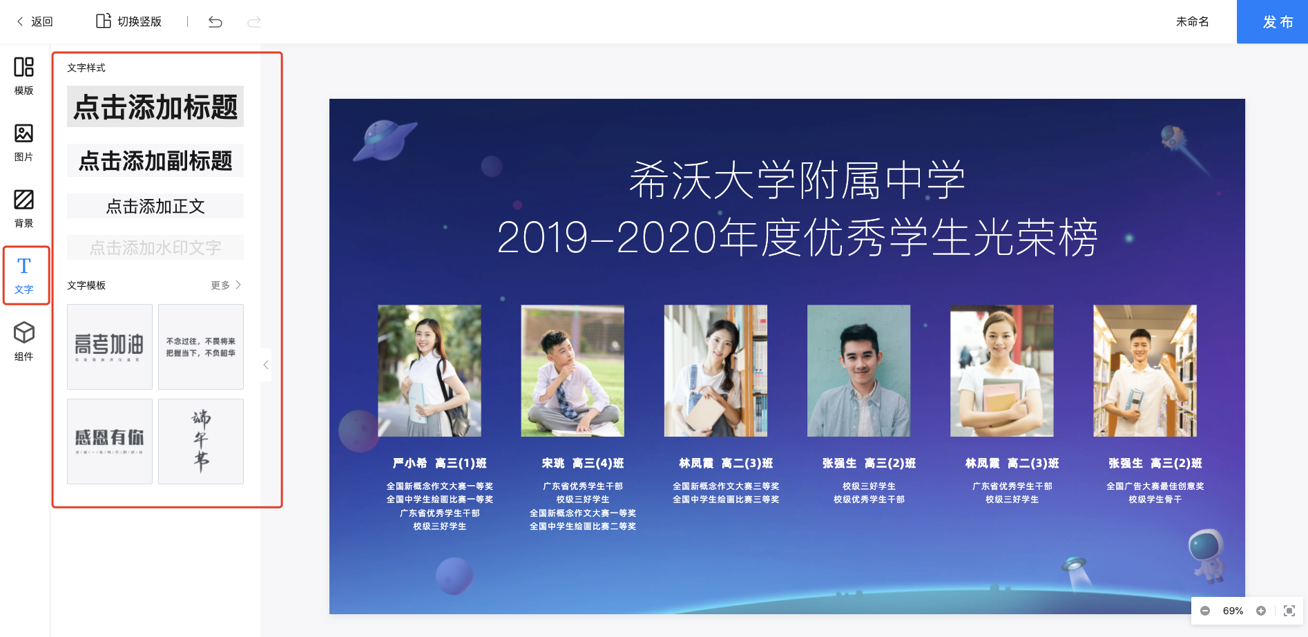 在文字模块,用户可以对文字大小、颜色、位置进行自定义。