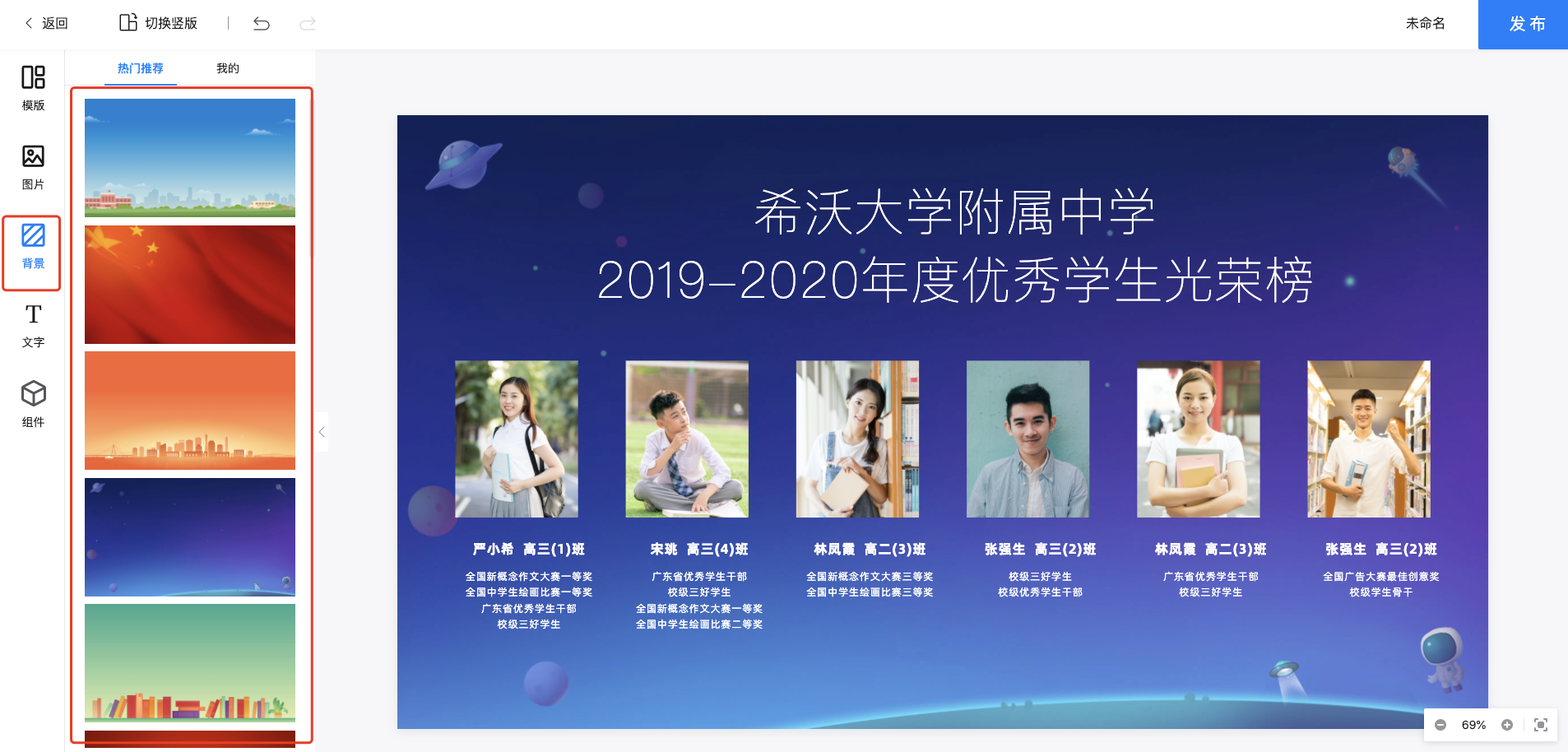 在背景模块,系统内置了多套背景模板。同时用户可以自定义上传“我的”背景模板。