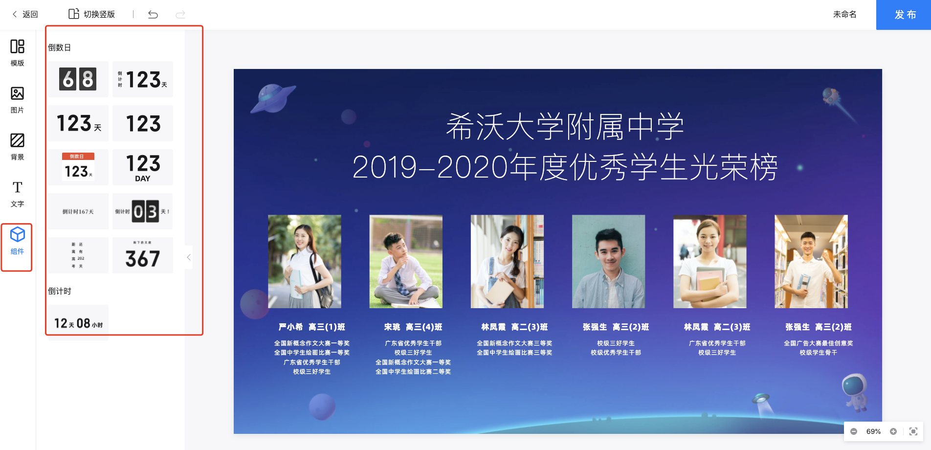 希沃云班提供了倒数日、倒计时2种组件,对于想要霸屏播放的倒数日/倒计时(如中考倒计时、高考倒计时、考试倒计时)均可以通过海报倒计时、倒数日组件实现