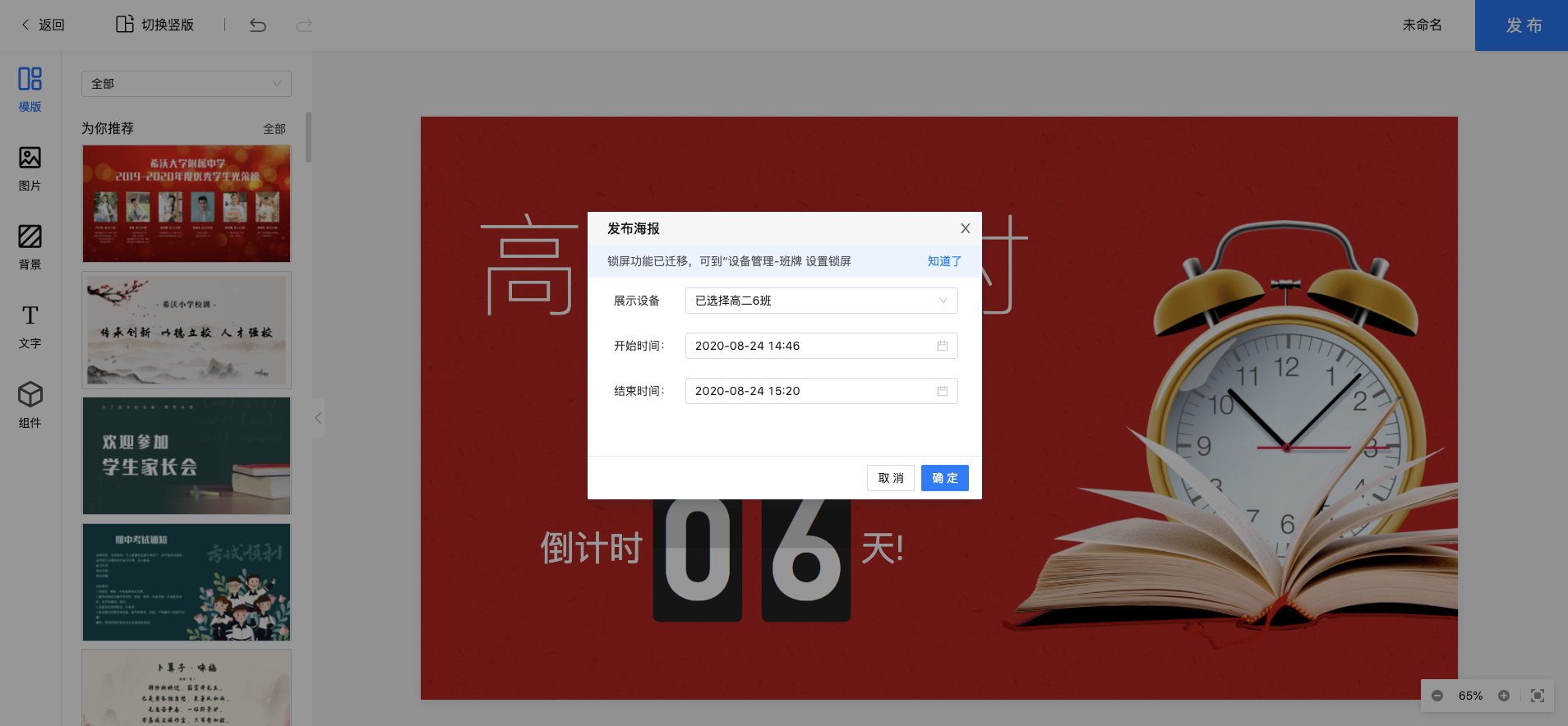 在编辑完成后,用户可以点击“发布”按钮,然后选择将海报发布到哪些设备(可以发布到任意自己拥有权限的班牌上)。