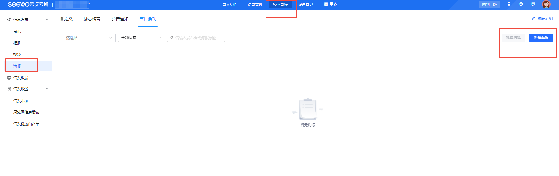 【海报】是信息发布的一种重要形式,主要特点是:背景自定义,文字排版自定义。老师可以将一些重要通知或学习素材等内容以海报这种比较易读和抢眼的形式来发布。同时,海报内置了丰富的素材模板,用户可以根据需要选择相应的模板稍加修改即可发布。