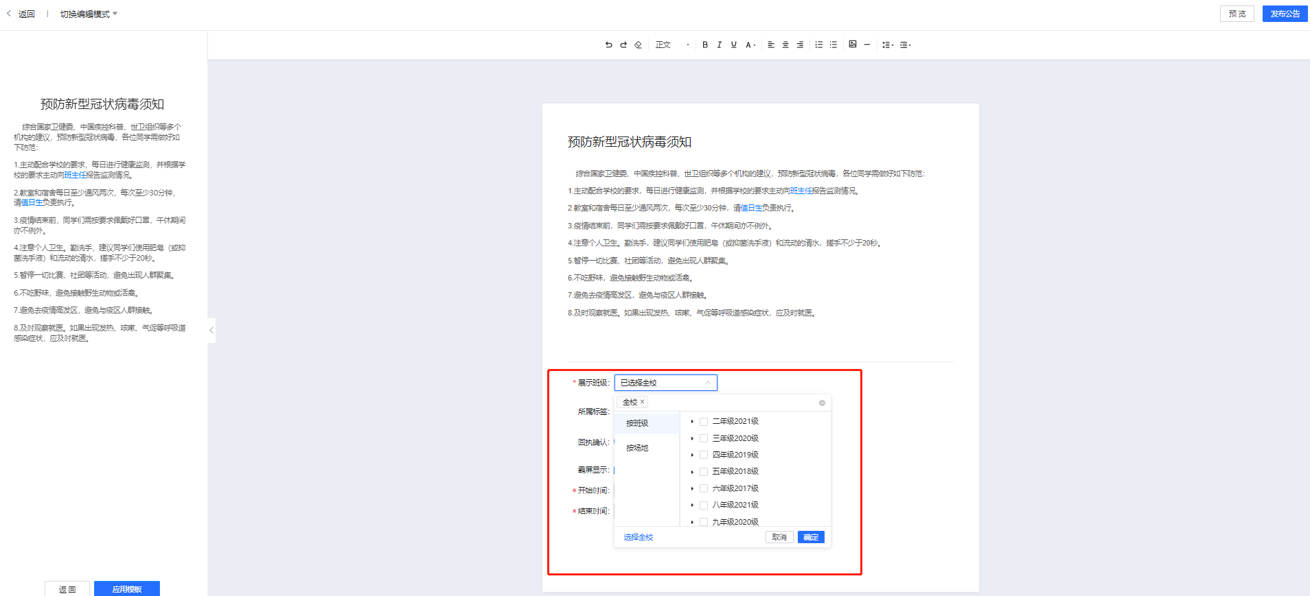 同样,管理员在发布公告时可以选择将公告发布到全校或任意指定班级。