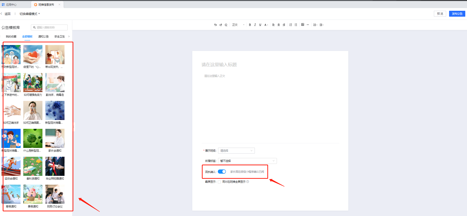 对于需要家长确认已读的公告消息,可以选择打开需要家长发送电子回执开关(在移动端可以查看各学生家长和回执明细)