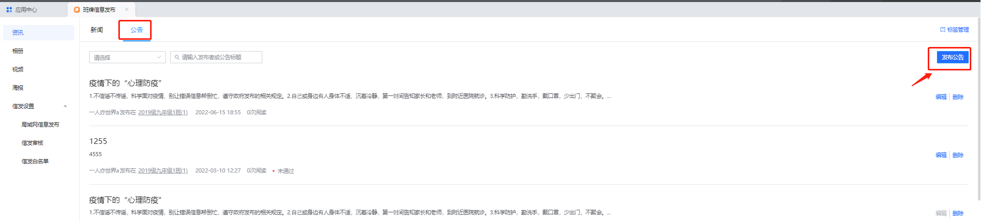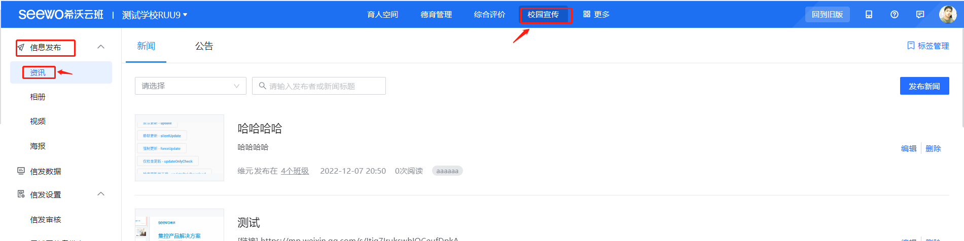 进入希沃云班后台,点击【校园宣传】-【信息发布】-【资讯】