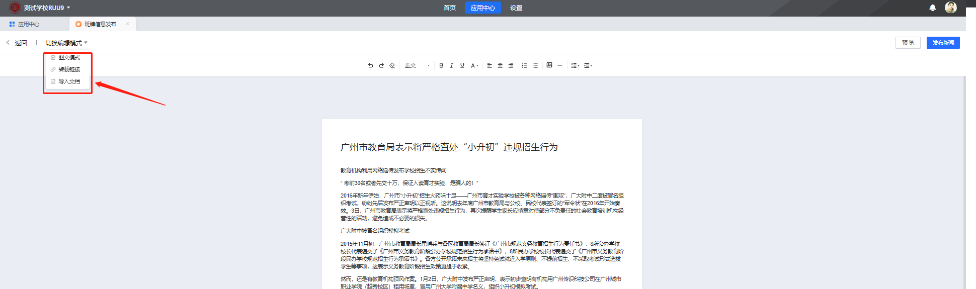 新闻页面包括图文模式、转载链接(直接发布复制的链接到班牌端)、导入文档(当前仅支持PDF)3种方式。