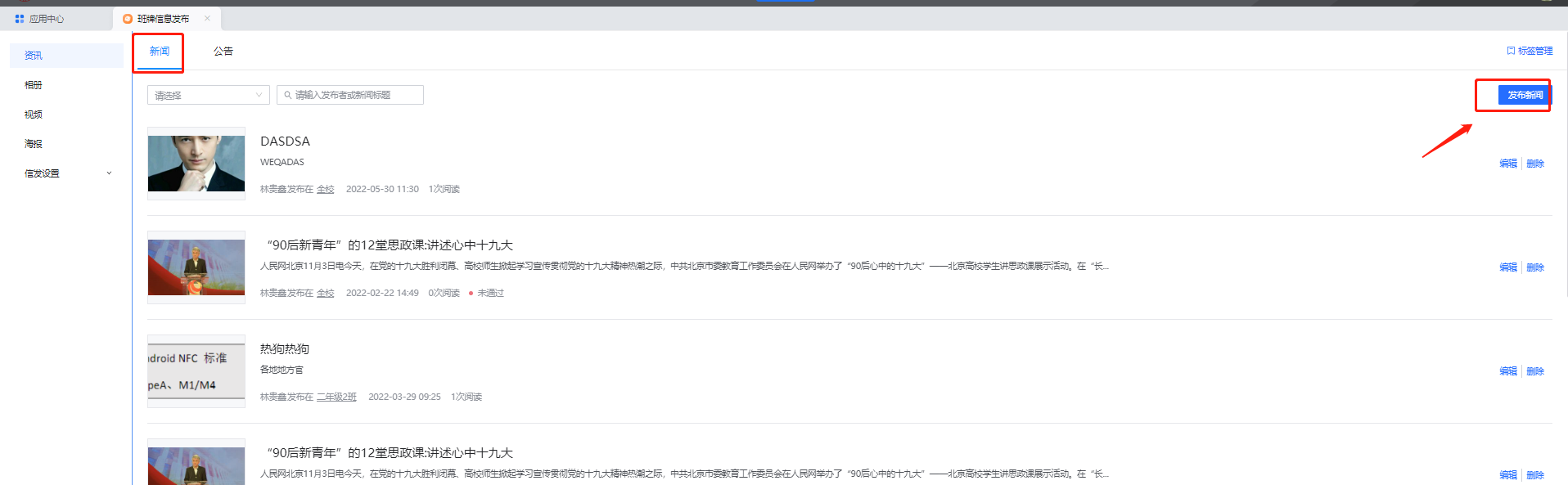 学校管理员可以点击【发布新闻】按钮,进入新闻编辑页面。