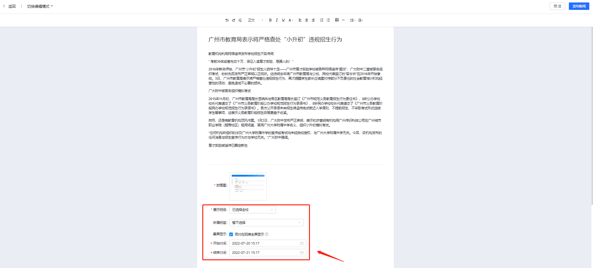 管理员在发布新闻时可以选择将新闻发布到全校或者指定的任意班级。同时,对于比较紧急或重要的新闻管理员可以选择指定时间在班牌霸屏播放。